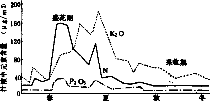 注:实验地1月至2月花芽生理分化期 磷(P) 在良好的磷素营养供应下,苹果根系,果实和种子,枝梢的形成层与花芽都能正常发育。幼树有充足的磷营养,可早成花,且多腋花芽,是幼树早结果、丰产的关键技术之一。与氮、钾比,在年生长周期中苹果树体内磷的含量变化较小(图2)。果实种子的发育、花芽分化,使枝干木质汁液中磷含量下降,而盛花期汁液中磷含量高是磷从根系中随树液向上流动的结果。土壤中有效性磷含量高,能促进氮的吸收,也有利于硼(B)、锌(Zn)、锰(Mn)的吸收,却不利于钙(Ca)的吸收。常见的缺锌小叶病,实际上不是叶片中锌的绝对量低造成的,当苹果叶片中P/Zn较小(如100)时,尽管叶片中锌量低于常量,植株也无小叶病,而P/Zn大于200时,则普遍表现出小叶病。土壤中磷过量,抑制根系对硝态氮、钾、铁的吸收,表现出类似于缺铁的失绿症。土壤中缺磷时,苹果树春季萌芽与开花均迟,芽萌发后成枝力弱,新根少,叶片小而明显地呈暗绿色至青铜色,缺磷的结果苹果树树势衰弱,易感腐烂病、果实水心病。 钾(K) 苹果树对钾的需要量很大(见图2)。钾可促进根和枝干的生长,特别是长粗。钾还有利于花芽生长,提高坐果率,改进果实品质。钾与氮、镁(Mg)、钙存在颉颃作用,尤其影响钙的吸收和利用,常因富钾而造成缺钙。故在土壤缺钙的条件下,施用钾肥的同时也应增施钙肥。