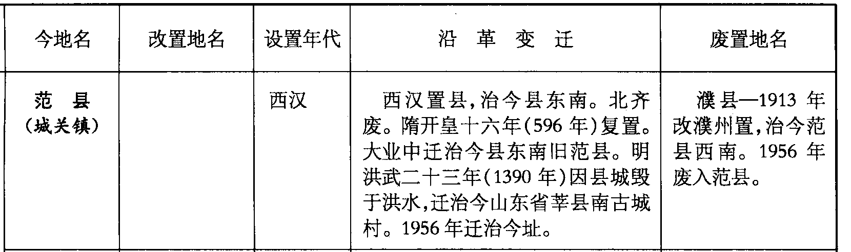 范县(城关镇)西汉西汉置县,治今县东南。北齐废。隋开皇十六年(596年)复置。大业中迁治今县东南旧范县。明洪武二十三年(1390年)因县城毁于洪水,迁治今山东省莘县南古城村。1956年迁治今址。濮县—1913年改濮州置,治今范县西南。1956年废入范县。