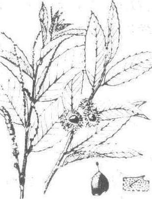 古代名物 > 木果類 > 果木部 > 喬木 > 栵 > 茅栗 茅栗 máolì 即栵。一種小栗。宋·沈括《夢溪筆談·辨證》:“江南有小栗,謂之茅栗。”明·李時珍《本草綱目·果一·栗》:“〔集解〕引保昇曰:‘茅栗似板栗而細如橡子,其樹雖小,葉亦不殊,但春生夏花,秋實冬枯為異耳’。” 茅栗Seguin chinkapinCastanea seguinii Dode,壳斗科,栗属。2n=24。原产中国长江流域。落叶小乔木,在瘠地常呈灌木状。叶椭圆形,背面密被灰褐色腺鳞。坚果小,径1~1.5 cm,可食用。结实能力甚强,并能一年多次结果。本种作为板栗砧木,一般嫁接不易成活。与板栗的杂交亲和力也较弱。
