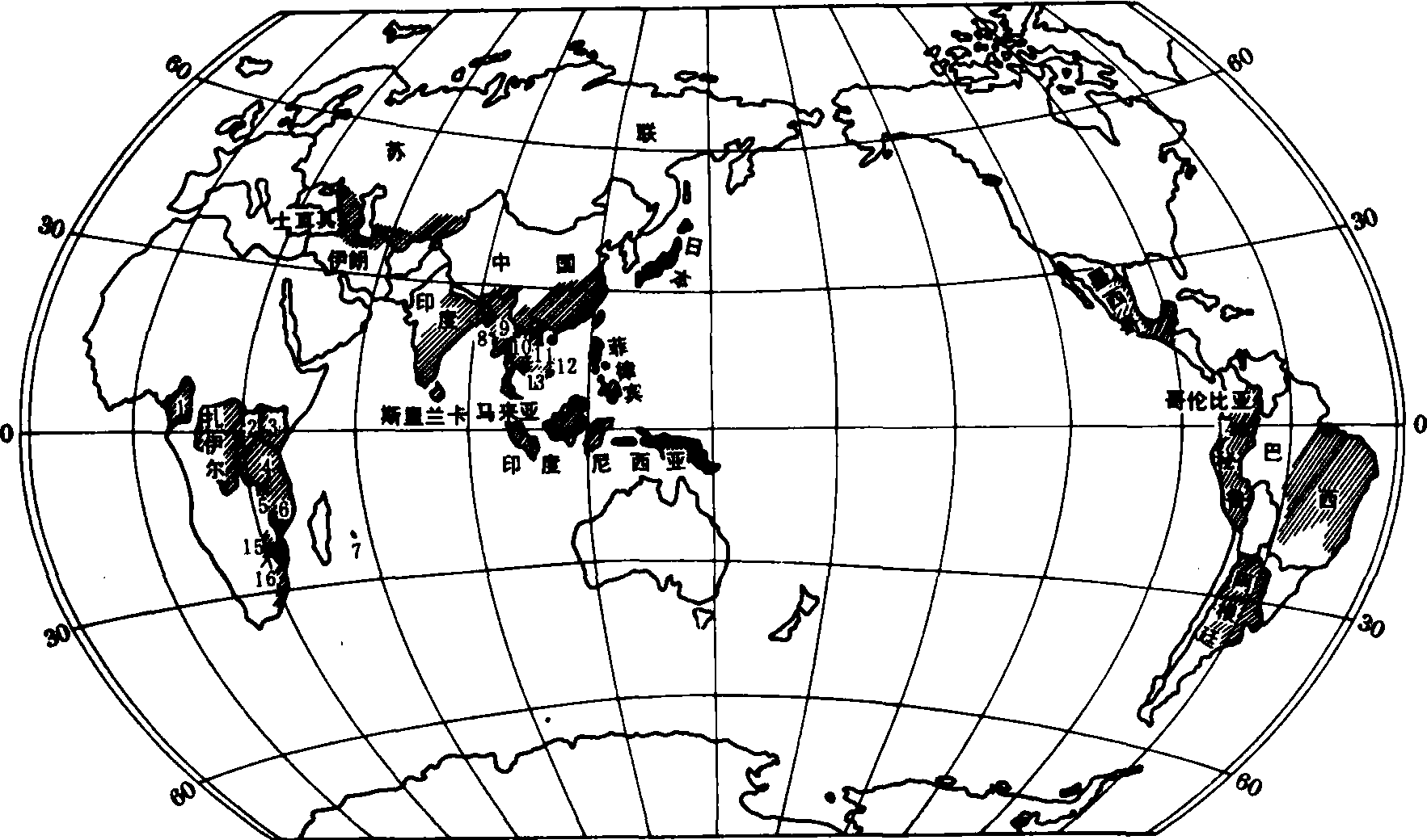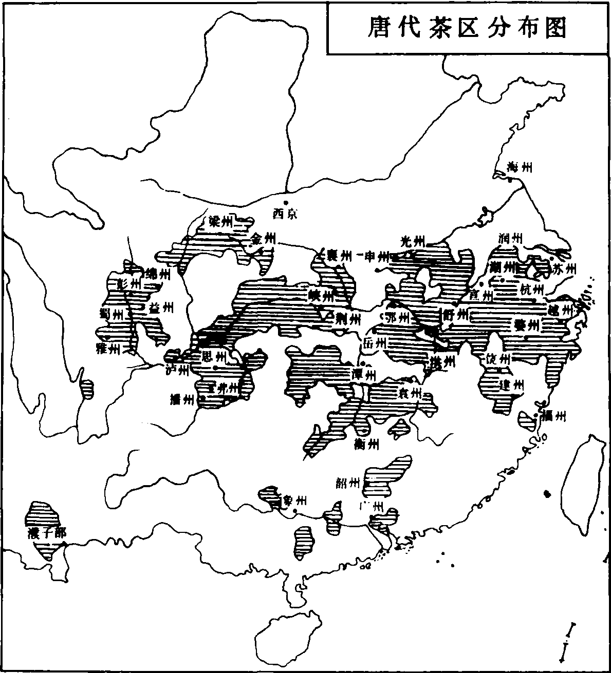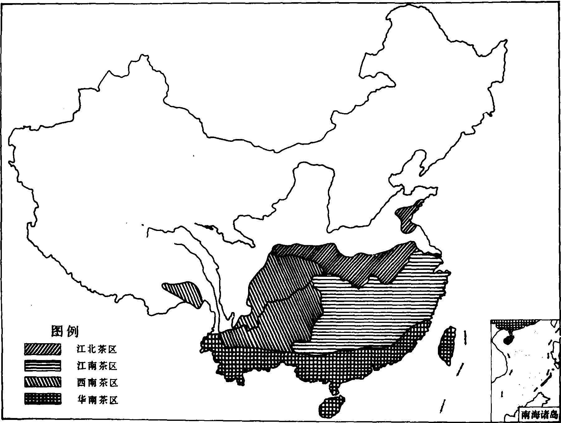宋、元、明代茶区 宋代茶区分布在长江流域和淮南一带。主要产地是江南路, 其次是淮南路、荆湖路、两浙路和福建路。至南宋, 全国已有66州242县产茶。并按成茶形态分成了片茶和散茶两大生产中心。元代茶区在宋的基础上又有新的开拓, 主产区是江西行中书省、湖广行中书省(包括湖南、湖北、广东、广西、贵州及四川南境),明代分区工作没有重大进展。 清代茶区 到了清代, 由于国内消费的增长和对外贸易的开展。促进了植茶范围的扩大,并形成了以茶类为中心的栽培区域。在鄂南的蒲圻、咸宁和湖南省临湘、岳阳等县形成了砖茶生产中心; 在福建省的安溪、建瓯、崇安等县形成了乌龙茶生产中心; 湖南省安化, 安徽省祁门、旌德、江西省武宁、修水等县和景德镇市的浮梁成了红茶生产中心;江西省婺源、德兴, 浙江省杭州、绍兴、江苏省苏州虎丘和太湖洞庭山成了绿茶生产中心; 四川省雅安、天全、名山、荥经、灌县、大邑、什邡、安县、平武、汶川等县以生产边茶著称; 广东省罗定、泗纶等地以生产珠兰茶而驰名。 中国近代茶区划分 20世纪30年代,吴觉农和胡浩川在1935年所著《中国茶业复兴计划》一书中, 根据茶区自然条件、茶农经济状况、茶叶品质好坏,分布面积大小及茶叶产品的出路等, 系统地将全国区划为13个茶叶产区。其中: 外销茶8个区, 包括红茶5个区(即祁红、宁红、湖红、温红、宜红)、绿茶两个区(屯绿、平绿)、乌龙茶一个区(福建乌龙):内销茶5个区 (即六安、龙井、普洱、川茶、两广)。 中国现代茶区划分 中华人民共和国成立后,中国茶区又有很大发展。其地理分布广阔,范围在18°~38°N, 94°~122°E;垂直分布最高到海拔2600米的高山, 低至几米的低丘。茶区主要分布在秦岭以南的浙江、湖南、安徽、四川、台湾、福建、云南、湖北、贵州、广东、广西、江西、江苏、陕西、河南以及山东、甘肃、西藏等18个省区。其中山东、甘肃、西藏等三个省区是近年来开发种植成功的。中国现有茶园1616万多亩,茶叶产量1985年为44万吨, (不包括台湾省的2.5万多吨)。生产的茶类以绿茶为最多, 其次是红茶, 还有乌龙茶、黄茶、白茶、花茶、紧压茶以及多种特种名茶。 图2 中国现代茶区 1982年,中国农业科学院茶叶研究所以生态条件、产茶历史、茶树类型、品种分布、茶类结构为依据,将全国划分为4大茶区, 即华南茶区、西南茶区、江南茶区、江北茶区(图2)。 华南茶区 位于福建省大漳溪、雁石溪, 广东省梅江、连江、广西壮族自治区浔江、红水河、云南省南盘江、无量山、保山、盈江以南。包括福建、广东两省中南部、广西壮族自治区和云南省南部以及台湾省。云南、广东、广西、台湾四省、区南部属热带季风气候,境内高温多雨, 长夏无冬。本区的北部地带,属南亚热带气候, 温暖而湿润。区内茶树品种资源丰富, 大山区中存在着乔木型大茶树, 呈野生状态与其它常绿阔叶树种混生。栽培品种主要为乔木型大叶种,小乔木和灌木型中小叶种也有分布。生产的茶类有红茶、普洱茶、乌龙茶、六堡茶,还有铁观音、凤凰单枞等名茶。 西南茶区 位于米仓山、大巴山以南,红水河、南盘江、盈江以北, 神农架、巫山、方斗山、武陵山以西, 大渡河以东。包括贵州省、四川省全部、云南省中北部以及西藏自治区的东南部。本区地形复杂, 地势高,属于高原。全区属亚热带范围, 水热条件较好,光照对茶树生育更为有利。由于秦岭大巴山屏挡寒潮侵袭, 冬季温和, 生长期长, 适于茶树生育。四川盆地内的丘陵地,四周多山, 寒潮不易入侵, 夏季焚风(干热风)现象显著, 气候特点是春早、冬暖、夏热、秋雨, 茶树生长期长。川南边缘丘陵, 年温差小, 日温差大,适于茶树生育。贵州是一个丘陵起伏的山地,西高东低, 平均海拔1000米, 冬暖夏凉, 多阴雨, 少日照, 茶树生育良好。云南为高原, 茶树分布于中暖层和低热层。西藏东南部海拔较低, 水热条件最好, 南部边缘茶树生育良好。西南茶区内茶树品种类型丰富,茶类众多, 有红茶、绿茶、边销茶、沱茶及花茶等。 江南茶区 是中国茶叶的主产区。北起长江以南,南到南岭以北, 东邻东海, 西与云贵高原为界。包括广东省、广西壮族自治区北部, 福建省中北部, 安徽省、江苏省、湖北省南部以及湖南、江西、浙江等省。本区气候特征是春和、夏热、秋爽、冬寒,四季分明。茶树萌发早、开采早、停采迟、是本区秋茶比率高的重要条件。本区水热条件尚好, 是茶树生长发育和制茶品质优良的重要原因。区内茶叶资源丰富、茶树品种主要是灌木型品种, 小乔木型也有少量分布。生产的茶类有红茶、绿茶、乌龙茶、白茶、黑茶以及各种特种名茶。 江北茶区 地域范围南起长江北岸, 北至秦岭、淮河以南, 西起大巴山, 东至江苏省东部沿海。包括甘南、陕南、鄂北、豫南、皖北和苏北部分地区。本区处于北亚热带北缘, 气温和降水量都相对减少, 茶树生育期间往往缺水, 同时受西伯利亚寒流侵袭, 茶树经常受冻减产。茶树品种多为灌木型中小叶群体,抗寒性较强。全区均生产绿茶, 有炒青、烘青、晒青等。 此外, 在山东半岛东部和东南部、江苏省东北部,虽然地理纬度最北已达37°N左右, 但由于气候受到海洋调节, 在小区域气候条件较好的地方, 也种植了一部分茶树。该地区属暖温带季风气候, 由于夏秋高