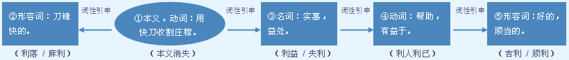 释义 | ![]() ❶ 锐利;锋利: ~爪|~剑。 钝 dùn ~器|~斧头|这把刀真~。 ❷ 利益;好处: ~多弊少|兴~除弊|~令智昏。 弊 bì ~病|~端|反复分析这样做的利与~。 害 hài ~处|灾~|为民除~|过度喝酒对身体有~。 ❸ 使有利: 发扬毫不~己、专门~人的精神。 害 hài 陷~|~人不浅|你把地址写错了,~得我白跑一趟。 ❹ 利润或利息: 暴~|获~|薄~多销|一本万~。 本 běn 保~|够~|~息|不做赔~生意。 ❶利益。 a.作宾语。 这样做对大家都没有什么~|可不能见了~就忘了义啊! b.作主语。 这种~咱不占不贪。 ❷利润或利息。 a.作宾语。 他是将本求~,你别太难为他|真的借钱不要~?我看张善人准是在骗你。 b.作主语。 试试看,~大就干,~小就拉倒,主动权在俺手里|明年本~一并还清。 锋利,锐利;顺利;便利。用作语素构成合成词。 尖~|锐~|锋~|犀~|不~|有~|顺~|便~|吉~。 使有利。作带宾谓语。 白求恩同志毫不~己,专门~人。 【近】 〈名〉❶益 【反】 〈名〉❶害 弊 〈形〉钝 〈动〉损 【词语】 利弊 利害 利己 利令智昏 利率 利诱 利欲熏心 字源解说 利,甲骨文 ![]() ![]() ![]() ![]() ![]() ![]() ![]() ![]() ![]() ![]() ![]() ![]() ![]() 附 文言版《説文解字》:利,銛也。从刀。和然後利,从和省。《易》曰:“利者,義之和也。” 附 白话版《说文解字》:利,铦,金属农具。字形采用“刀”作边旁。谐和而后各有所利,所以采用省略了“口”的“和”。《易经》上说:“利益,是道义相和的结果。” 引申线索 ![]() 【字族索引】 利 【同音字】 lì |