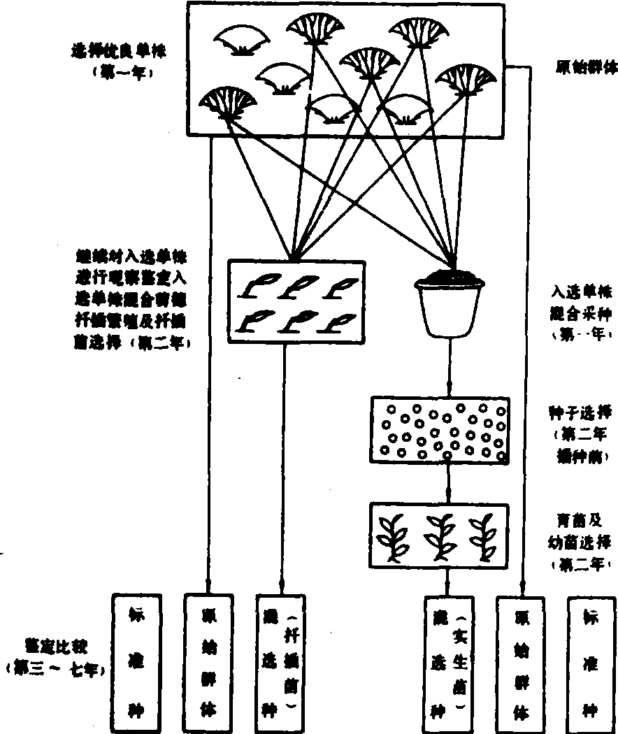 释义 | 茶树混合选择mixed selection of teaplant茶树选择育种法之一。是从混杂的茶树群体品种中, 按育种要求选出一群优良单株, 然后采集种子混合播种, 或进行无性繁殖, 再与同龄对照品种及原始群体进行比较。此法简便, 能较快地提高群体品种的纯度, 有时还可在短时间内从原有群体品种中分离出优良类型, 迅速满足生产上的需要。其主要缺点是: 因为选择是根据表现型来进行的, 当然, 在一定程度上表现型也是基因型的反映,但是有些性状,特别是一些数量性状,往往因环境影响而表现悬殊。有时可能将一些表现型良好, 而基因型并不理想的个体也选进来。这样就降低了选择的效果。中国茶区的主要栽培品种, 多为有性群体品种, 一般都较混杂, 如进行混合选择, 一定大有成效。 茶树混合选择图式 |