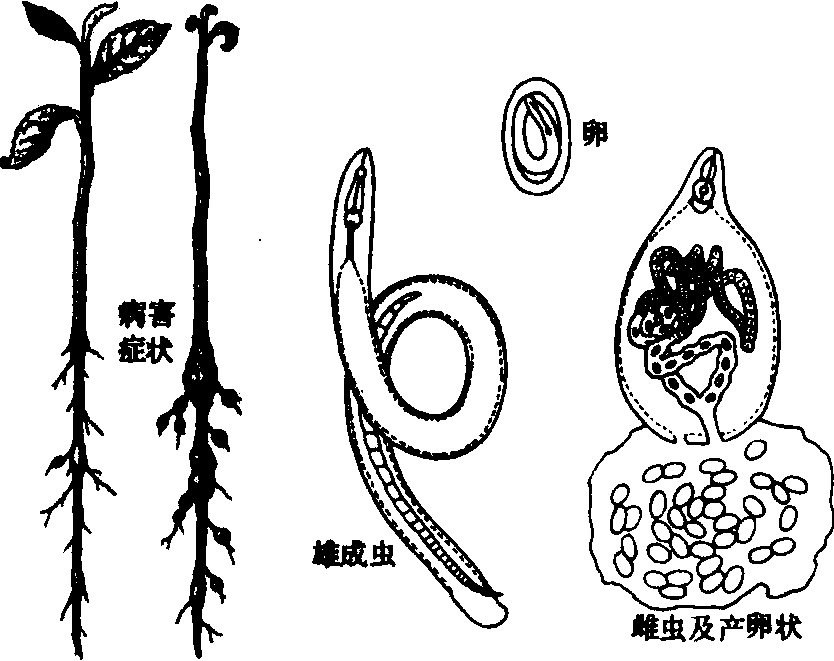 释义 | 茶苗根结线虫病tea seedling diseasescaused by rootknot nematodes茶苗根部寄生性线虫病害之一。分布于浙江、安徽、台湾、福建、广东、广西、四川、云南等省区; 斯里兰卡、印度、日本和非洲等产茶国均有发生。此外还为害瓜、豆、薯、麻、烟、桑、果等植物。 茶苗根结线虫病 病原 主要为南方根结线虫,学名为Meloidogyne-incognita (Kofoid and White head) Chitwood,其次为爪哇根结线虫学名为M.javanica(Treub.)Chitwood、花生根结线虫学名为M.arenaria(Neal)Chitwood和泰晤士根结线虫学名为M.thamesi Chit-wood, 国际上还记载有北方根结线虫学名为M.hal-pa Chitwood和短体根结线虫学名为 M. brevicaudaLoos, 后者除加害茶苗外, 还加害成龄茶树。上述各种线虫均属线形动物门、线虫纲垫刃目根结线虫科根结线虫属。一生有卵、幼虫和成虫三个发育时期。雄成虫线形, 长宽为1.20~1.50×0.03~0.04毫米; 雌成虫柠檬形,头部尖,身体膨大, 长宽为0.44~1.30×0.33~0.70毫米, 卵产于雌虫尾端的胶质卵囊内。 侵染规律 以雌成虫和卵在病根虫瘿中越冬。1龄幼虫在卵内生活, 从卵内孵出的是2龄幼虫, 通过土壤或虫瘿组织到达新根, 从根尖附近侵入, 固定寄生。成熟雄虫逸出根组织在土中自由生活, 寻找雌虫交配。当环境适宜时, 20~30天完成一代。病根残留组织和病土均可通过人为活动作远距离传播。砂质土利于发病, 熟地比生地发病重。1~2年生茶苗感病显著, 茶树品种间抗病性差异较大。 防治 必须强调“预防为主、综合防治”的原则。选用无病地育苗或植苗; 使用感病地时,约提前两个月在烈日下多次翻晒土壤, 杀灭土中线虫; 尽量选用适宜当地种植的高产抗病品种: 加强肥水管理、增强茶苗抗病能力; 控制病苗扩散; 有些国家还间作万寿菊抑制线虫种群数量; 使用涕灭威、呋喃丹、灭线磷、克线磷等进行化学防治。 茶苗根结线虫病tea seedling disease caused by rootknot nemtodes茶苗根部寄生性线虫病害。分布于中国各产茶省区。斯里兰卡、印度、日本和非洲等地茶区均有分布。为害茶树、烟、麻、桑、瓜等。在茶苗根部有大小不等的圆形瘿瘤,使须根少发或不发,地上部分矮小黄化。病原包括多种根结线虫,以南方根结线虫〔Meloidogyne incognita(Kof. & White) Chit.〕为主。属线形动物门根结线虫科。雄成虫线形,长宽1.20~1.50 mm×0.03~0.04 mm。雌成虫柠檬形,头部尖,大小0.44~1.30 mm×0.33~0.70 mm。以雌成虫和卵在病根虫瘿中越冬。线虫可通过病根残留组织和病土远距离传播。砂质土利于发病。1~2年生茶苗最易感染。宜选用无病土育苗,加强管理以增强茶苗抗病性;种植危地马拉草可起到诱集和减少线虫数量的作用;发生严重的苗圃可用灭线磷、呋喃丹等杀线虫剂。 |