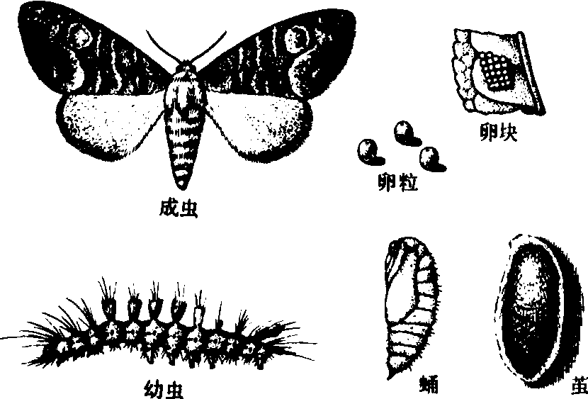 释义 | 茶茸毒蛾tea black tussock moth茶树芽叶害虫之一, 又名茶黑毒蛾,属鳞翅目毒蛾科,学名为Dasychira baibarana Matsumura。 茶茸毒蛾 生活习性 在皖南一年发生4代,以卵块越冬,次年3月下旬至4月上旬孵化出第一代幼虫, 其余3代为害峰期分别在4月中旬至5月上旬,6月中旬至7月中旬, 8月下旬至9月中、下旬。成虫夜晚活动, 有趋光性。卵成块或分散产于叶背或根际杂草上。初孵幼虫群聚于茶丛中、下部老叶背面, 取食叶肉, 残留表皮呈透明枯斑, 2龄后开始分散, 将叶片蚕食成缺刻。幼虫具假死性,受惊则吐丝下垂,或坠落卷缩不动。老熟后迁至茶丛基部落叶或表土内结茧化蛹。 防治 结合清园, 消灭越冬卵。扑杀初孵群聚幼虫。喷施50%马拉松800倍液或拟除虫菊酯类农药6000~8000倍液毒杀幼虫。 茶茸毒蛾tea black tussock mothDasychira bai-barana Matsumura,又称茶黑毒蛾。鳞翅目,毒蛾科。分布于日本及中国的安徽、浙江、云南、台湾等省。为害茶、油茶。成虫翅展27~40 mm,栗褐色,前翅近基部和外缘色较深,多横纹,近翅尖处有3~4个深色纵纹,中部近前缘有一灰黄色圆斑,近臀角有一灰白斑点。末龄幼虫体长23~32 mm,黑褐色,多毛,第1至4腹节背面各有1对棕褐色长毛束耸立,第5节背面有1对黄白色毛束,第8节有1对黑褐色毛束向后斜伸。一年发生4代,以卵块越冬。成虫趋光。卵产于叶背或杂草上。初孵幼虫群聚叶背,2龄后分散,有假死性。老熟后至落叶下或表土内结茧化蛹。防治方法主要是清园灭卵;捕杀初孵幼虫;喷施农药。 |