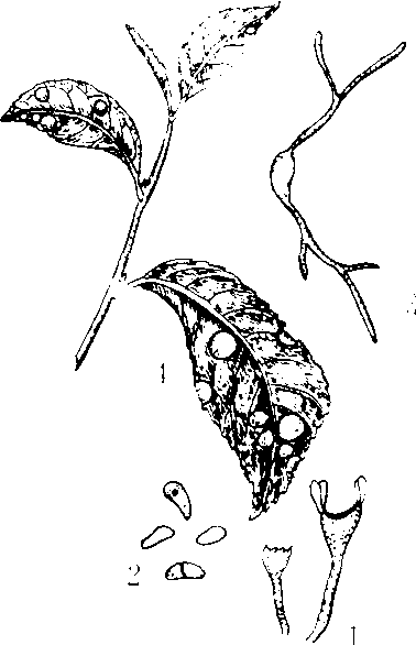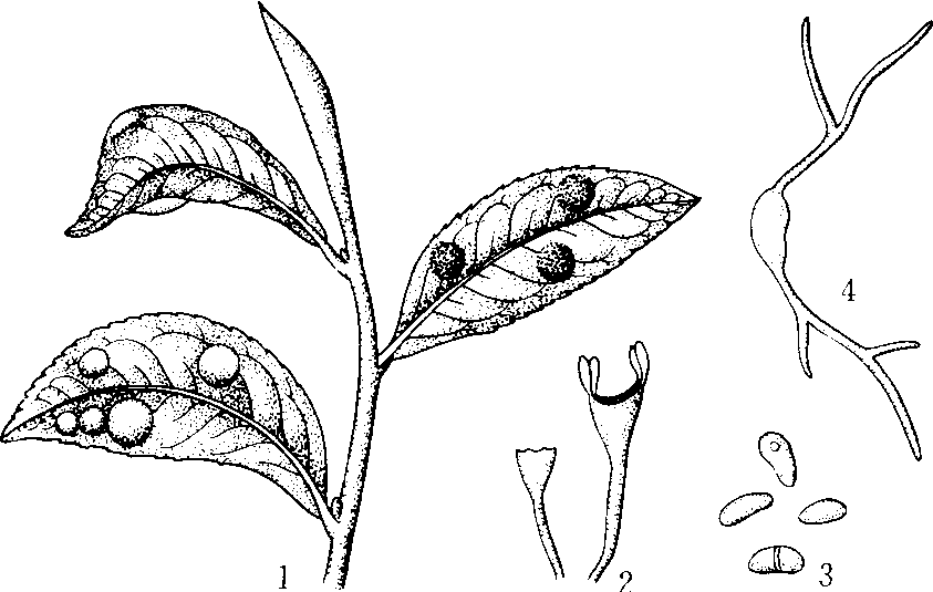 茶饼病症状和病原物 1. 症状; 2. 病菌担子和担孢子; 3. 担孢子;4. 萌发中的担孢子