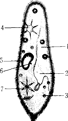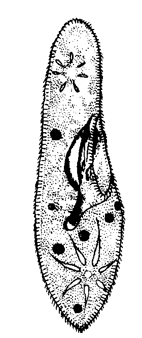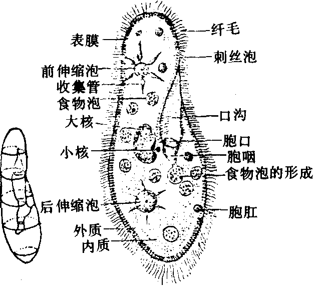 释义 | 腔肠动物 腔肠动物蚯蚓:蚓(土蚓;丘蚓;附蚓;寒蚓) 螾(地螾;丘螾) 蟺(土蟺;曲蟺;蜿蟺) 蟮(曲蟮;蛐蟮;蛴蟮) 螼(螼螾;螼蚓) 地龙 土龙 蜸蚕 歌女 龙媒 蠢蝡 鸣砌 曲善 ☚ 两栖动物 节肢动物 ☛ 草履虫Paramoecium纤毛纲,膜口目,草履虫科。体形在显微镜下观察似倒置的草鞋,故名。体圆筒形,前端较钝,中后部宽,后端尖削。体表密被纤毛,呈纵行排列,作规律性的摆动,用以运动。在体腹侧,自前端斜向中部有一凹入的小沟,即为口沟。口沟底部有胞口,下连胞咽。由于口沟内的长纤毛和胞咽内的纤毛带(即波动膜)的摆动,鼓起水涡,使水中的有机颗粒碎屑、细菌等沿水流经胞口、胞咽,并在胞咽末端形成食物泡。伸缩泡两个,一前一后。核有大、小核两种。无性生殖为横分裂,有性生殖为接合生殖。常见的有尾草履虫(P.caudatum)、双小核草履虫(P.aurelia)等。 草履虫 1.口沟 2. 胞咽 3.胞肛 4. 伸缩泡 5. 大胞核 6. 小核 7. 收集管 草履虫 草履虫caoluchongParamoecium caudatum无脊椎动物,原生动物门,纤毛纲的主要代表动物之一,又称尾草履虫。生活在有水草的淡水池沼和水沟中,为最常见的大型原生动物。喜聚集在有机物较多和阳光充足之处,营自由游动生活。体呈圆筒形,长约250~300微米,前端钝圆,中部较宽,后端稍尖。体形轮廓似倒置的草鞋底,故称为草履虫。体表有1层表膜(可排泄代谢废物),密生纤毛,前端的纤毛较短,较为活动,后端的纤毛较长,不甚活动,离前端1/3处的一侧向后,有1条斜伸至体中部的纵深沟,沟底有胞口,称为口沟。口沟内有密生的长纤毛,可激动水流,借以摄取水中的细菌等食物进入体内,同时还可使身体旋转前进。未经消化的食物残渣,即经胞肛排出体外,体内靠近背侧的前后1/3处,各有1个伸缩泡和放射状排列的几条收集管,可交替收缩,通过排泄孔排出体内多余的水分和部分代谢废物。体内还有1个与营养代谢有关的肾形大核和1个与繁殖、遗传有关的球形小核。草履虫易于采集和培养,可作教学、科研的实验材料。我国最常见到草履虫还有双小核草履虫(Paramecium aurelia),体长约80~170微米,形似尾草履虫,有2个伸缩泡,但收集管较短,有2个小核;多小核草履虫(Paramecium multi-micromuleatum),体长180~310微米,外形也似尾草履虫,有时有3个伸缩泡,小核多达3~12个,绿草履虫(Paramecium bursaria),体长80~150微米,小核仅有1个,生活在清水池塘,体内有绿藻共生,在见光处培养后,体呈绿色。 图118 草履虫的结构 ☚ 纤毛纲 多孔动物门 ☛ 草履虫 草履虫Caoluchong原生动物门纤毛纲的种类,于透光处用肉眼观察草履虫培养液,可见虫体为上下游动的细微白点,大型种类体长可达200微米。在显微镜下观察,草履虫全身披满纤毛,从体前端外侧向体后端内侧具一长漏斗状的口沟,其内的一列纤毛摆动尤为迅速,从而与体表其它部位的纤毛摆动配合,使草履虫旋转式地向前运动。由于水流经口沟处呈旋涡状,食物颗粒(微生物、小纤毛虫等)即落入口沟底部的胞口,进入胞咽内并在其底部积累,逐渐形成食物泡并脱离胞咽,在体内随内质流动循环一周,其间食物泡与溶酶体融合,食物被消化,不能消化的残渣由胞肛排出。草履虫从摄食到排遗的全过程可通过往玻片培养液中滴加稀释的墨汁来观察。草履虫通常进行无性的横二分裂,在一定的环境条件下进行有性的接合生殖。接合时两虫体口沟相对粘合在一起双双游动,各自体内的大核消失,小核分裂产生一大核(相当雌配子)和一小核(相当雄配子),小核通过两虫体间的原生质桥交换并与大核融合,然后两虫体分开,每个虫体的融合核经几次分裂最后产生4个子体。 草履虫 草履虫生活在有机质丰富、缓慢流动的淡水或水洼中,室内极易培养。取约10克稻草剪碎置1 000毫升水中沸煮5—10分钟后,将采集来的草履虫10—20个接种于稻草液内(注意避免混入轮虫、溞等动物),用滤纸或纱布盖住培养瓶的瓶口,室温下培养,2周后即达一定密度。如果在液面上撒少许玉米粉或奶粉可加速其繁殖。 ☚ 变形虫 水螅 ☛ |