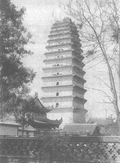 位于陕西西安城南门外的荐福寺内,建于唐中宗景龙元年(707年),因比大雁塔小,故名小雁塔。塔为密檐式,砖砌,平面呈方形,原为十五层,高四十五米,最上两层已震坍,现存十三层,高度为四十三点三米。塔壁不设柱额,每层砖砌出檐,檐部迭涩砖,间以二层菱角牙子。檐上塔窗左右用迭涩砖砌成低矮的平座,与一般密檐式塔形制不同。塔身逐层收刹成秀丽舒畅的卷杀轮廓。各层南北有圆形拱门,门楣刻有蔓草花纹和天人供养图像。全塔造型玲珑秀气,与大雁塔的雄伟壮姿,互相辉映。此外,小雁塔基础建筑技术高超,夯筑塔基而成船形体,具有极强的抗震性能。千余年来,历经七十余次地震,塔顶虽毁但塔身屹立。