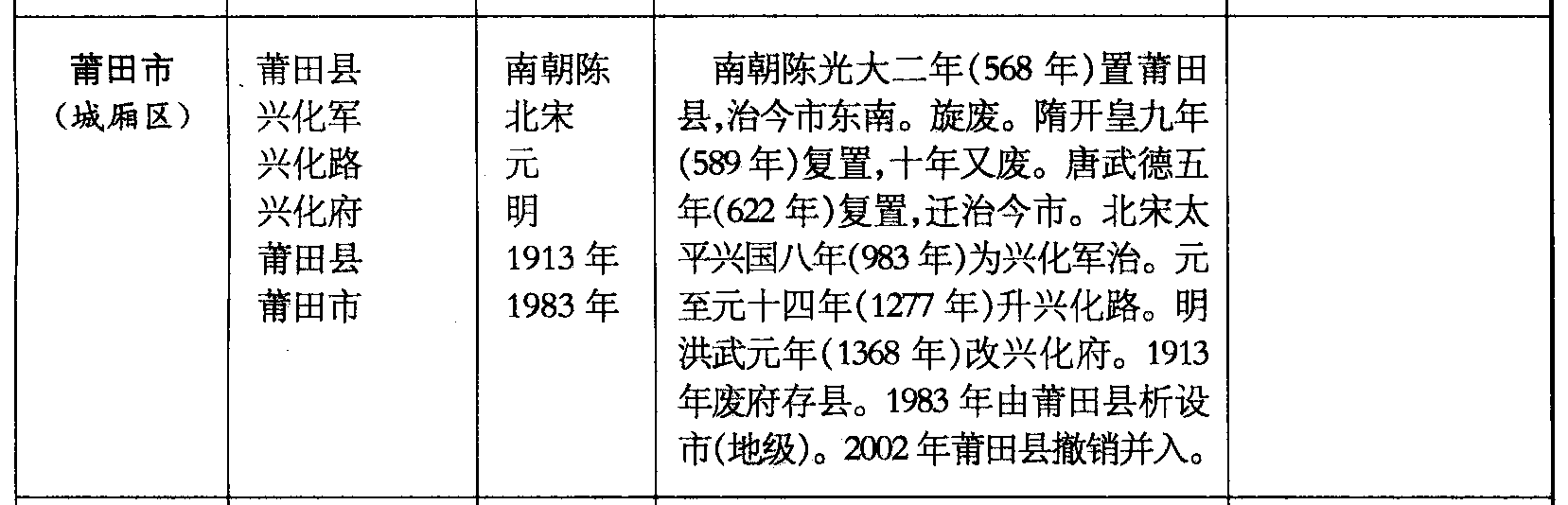 莆田市(城厢区)莆田县兴化军兴化路兴化府莆田县莆田市南朝陈北宋元明1913年1983年南朝陈光大二年(568年)置莆田县,治今市东南。旋废。隋开皇九年(589年)复置,十年又废。唐武德五年(622年)复置,迁治今市。北宋太平兴国八年(983年)为兴化军治。元至元十四年(1277年)升兴化路。明洪武元年(1368年)改兴化府。1913年废府存县。1983年由莆田县析设市(地级)。2002年莆田县撤销并入。