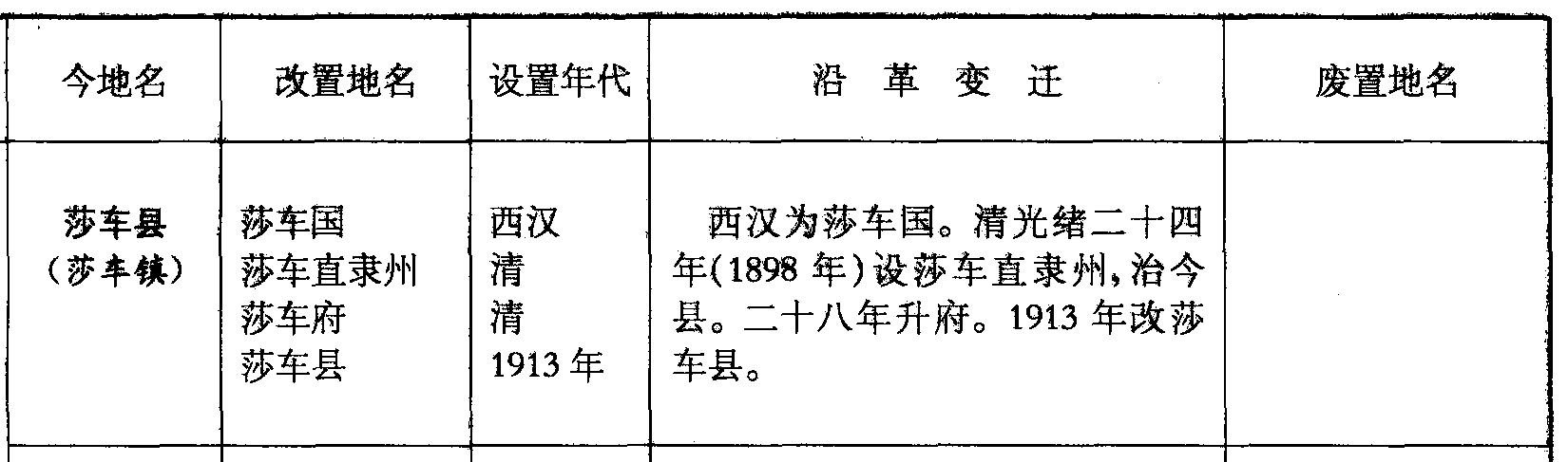 莎车县(莎车镇)莎车国莎车直隶州莎车府莎车县西汉清清1913年西汉为莎车国。清光绪二十四年(1898年)设莎车直隶州,治今县。二十八年升府。1913年改莎车县。
