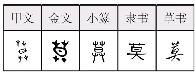 莫 甲骨文; 金文; 篆mò[茻(草叢,意符)+日(太陽,意符)→莫(《説文》:“莫,日且冥也。從日在茻中。”莫,日殁於草叢,天快黑了。爲“暮”本字。篆文繼承初文,楷化爲“莫”。借爲“不”“勿”,表示否定。姓。)] 《詩經·邶風·終風》:“莫往莫來,悠悠我思。”(不來又不往,老是把他想。) [唐] 韓琮《駱穀晚望》:“公子王孫莫來好,嶺花多是斷腸枝。”(公子哥兒不來好,斷腸人兒怎能登嶺把那斷腸花兒找。) [宋] 蘇軾《定風波》:“莫聽穿林打葉聲,何妨吟嘯且徐行。”(勿聽風吹樹葉沙沙聲,何不吟詩長嘯慢慢行。) [宋] 蘇軾《石鐘山記》:“至莫(暮)夜月明,獨與邁乘小舟至絶壁下。” 莫 mò(10画)