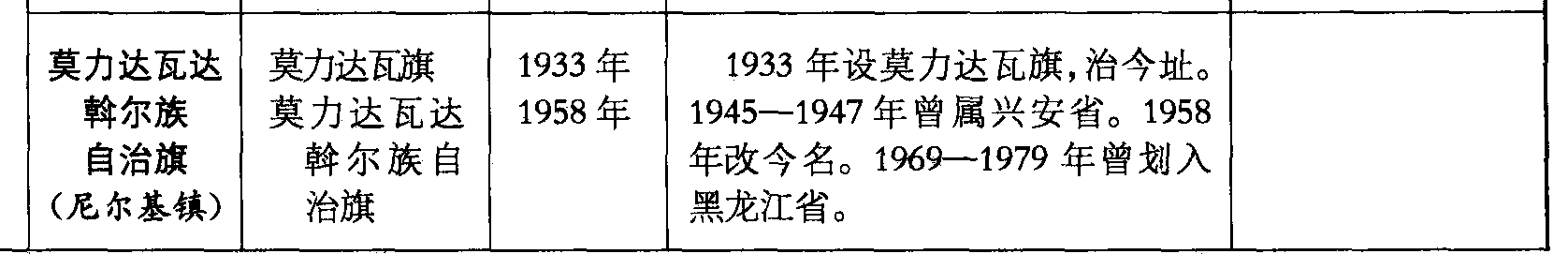莫力达瓦达斡尔族自治旗(尼尔基镇)莫力达瓦旗莫力达瓦达斡尔族自治旗1933年1958年1933年设莫力达瓦旗,治今址。1945—1947年曾属兴安省。1958年改今名。1969—1979年曾划入黑龙江省。