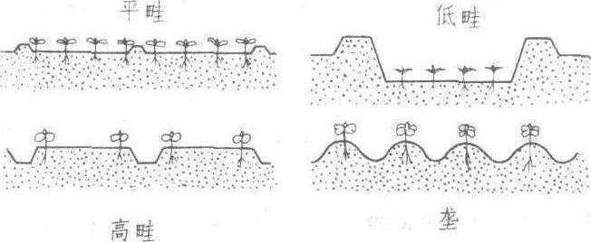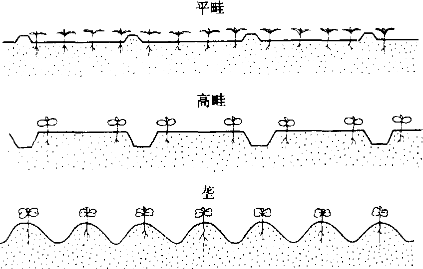 菜畦形式示意图 畦的方向 畦向(指畦的长边的沿长方向)与地面接受辐射光照的状况有密切关系。畦向不同,植株受到的日光强度、辐射热及空气流通状况不同,从而影响到植株群体中的温度、日照及水分状况。畦向应考虑栽培季节和地势倾斜度,冬、春季的高畦或高垄多用东西向,以使其南侧较多地接受太阳辐射光热,提高土温。早春在高垄的南侧播种小型萝卜、马铃薯或定植莴笋等,可以提早收获。地势倾斜的地块,畦向应考虑到保持土壤水分和防止土壤冲刷等因素。菜畦ridge of vegetable为便于蔬菜灌溉排水施肥及田间操作等将整片菜地分割筑成的小区。有平畦、低畦、高畦和垄等多种形式。 ❶平畦:畦面与地面在同一平面上的畦。适于雨量均匀、排水良好、不需要经常灌水排水的地区采用。 ❷低畦:畦面低于地面的畦。适于经常灌溉的干旱地区采用。 ❸高畦:畦面高于地面的畦。适于雨水较多需要排水的地区采用。 ❹垄:一种畦面较窄的高畦。垄上窄下宽,土层深厚,排水良好,干旱时可沟灌;适于栽培甘蓝、白菜、萝卜、甘薯、瓜类或根茎蔬菜。