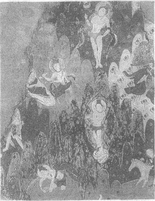 新疆维吾尔自治区拜城县克孜尔石窟第14窟顶部西侧壁画。专家将第14窟划分在克孜尔石窟第二期。第二期壁画的创作时间约为两晋。此图左下侧绘大施抒海。讲的是商主大施入海求宝,历尽艰辛求得三宝珠,后又被海龙王夺去。大施发誓要竭尽全力掏海水,若不复得三宝珠绝不回还。他走到海边“得一龟甲,两手捉持,方欲抒海”,诸天前来协助,海水大减,海龙十分恐怖,将珠还与大施。这个故事见于《贤愚经》卷八。图中一男子裸露上体,着短裤,在弯腰持器淘海水,上方有诸天前来协助。人物动作自然,水面具有装饰性很强的波纹,画面的色彩较为爽快。
