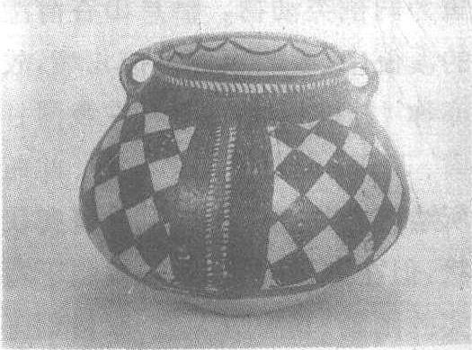 新石器时代马家窑文化半山类型。高15.4厘米,口径12.8厘米。1975年甘肃省兰州沙井驿出土。甘肃省博物馆藏。“半山”彩陶是因最初发现于甘肃省和政县半山地区而得名。碳素测定距今4040±100年。半山彩陶多用红黑两色绘制。主要纹饰有锯齿纹、网纹、动植物纹和螺旋纹。此罐侈口、短颈、扁圆腹、肩贴两耳。腹部以两条纵宽带分成三份,用黑色和黄色绘制菱格纹。口颈部外面绘细小的斜格,内口沿画黑色连弧线。整个器物构图均衡对称,绘画技巧熟练自如,给人以绚丽多彩的感受。
