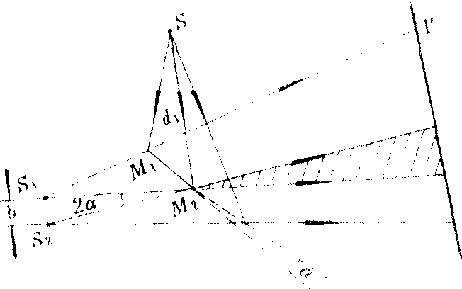 一种双光束分波面干涉实验。1818年,法国物理学家菲涅耳所做。两个平面镜M1和M2相互交成一个很小的角度α(如图),线光源s平行于M1和M2的交线。s发出的光波的一部分波阵面被M1反射,另一部分波阵面被M2反射。观察屏P位于两反射光束重叠的区域(图中阴影区域)内,由屏上呈现明暗相间的直干涉条纹。S被M1和M2反射所成的虚象分别为S1和S2,可以认为两反射光束分别S1和S2发出,S1和S2就相当于杨氏双缝干涉实验中的双缝。若S到M1和M2的交线的距离为d1,则S1和S2到交线的距离亦为d1,而S1和S2之间的距离b=2d1sinα。