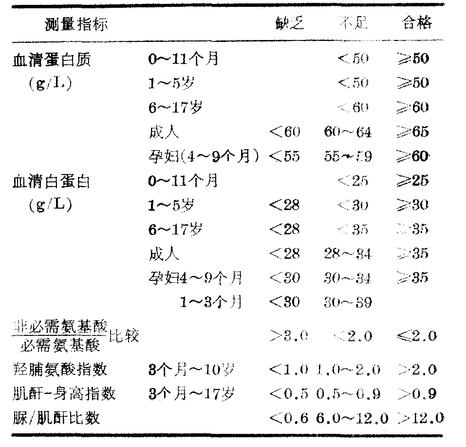 释义 | 营养状况实验室检查 营养状况实验室检查营养状况的实验室检查是利用多种生化测定来估计体内各种营养素含量,为营养状况评定提供依据。检查方法有下列几种: 表1 评价蛋白质-热量缺乏时的标准 蛋白质-热量缺乏和铁缺乏可能共存,应进行鉴别。 ❼氮平衡: 通过测定摄入氮与排出氮以评价人体蛋白质营养状况。维持平衡表示摄入氮可满足基本需要。由于氮平衡方法较繁琐,在现场较难进行,因此近年来有人由摄入氮推算氮平衡,方程也较复杂。我国陈学存等在实验中发现,摄入氮与氮平衡相关,他们提出按每千克体重计算,Y(氮平衡)=-47.61±0.33x(摄入氮)。 ❽免疫功能:蛋白质-热能营养不良常伴有免疫功能降低,表现有白细胞计数、淋巴细胞百分数减少及迟发性超敏皮试低下。 脂肪营养状况 ❶血脂测定: 长期摄取脂类过多时血脂增高。我国成年人正常血清中含甘油三脂0.28~1.70mmol/L,胆固醇3.5~6.5mmol/L。β-脂蛋白2.19~3.40g/L。也可测高密度脂蛋白-胆固醇作为评价的指标。 ❷体脂含量测定 (参见人体测量条)。 维生素营养状况 ❶维生素A(视黄醇): 可检查暗适应机能及血浆维生素A浓度。暗适应异常是维生素A营养不良晚期才出现的评价指标,但简便易行,便于现场应用。血浆维生素A可用微量荧光测定法评价成年人标准是: <0.35μmol/L (100μg/L)为缺乏; 0.35~0.66μmol/L(100~190μg/L)为不足(即边缘状态); >0.7μmol/L(200μg/L)为合格。儿童1.05μmol/L (<300μg/L)为不合格。血清视黄醇和视黄醇结合蛋白的含量呈显著平行关系,测定血清视黄醇结合蛋白含量,也可用来评价维生素A营养状况。 ❷硫胺素: 通常用荧光法或微生物法测定尿中硫胺素的排出量。由于收集24小时尿比较烦琐,常测定空腹尿或查硫胺素含量对肌酐含量的关系,亦可用负荷试验等方法。 表2 尿中硫胺素排出量的评价标准