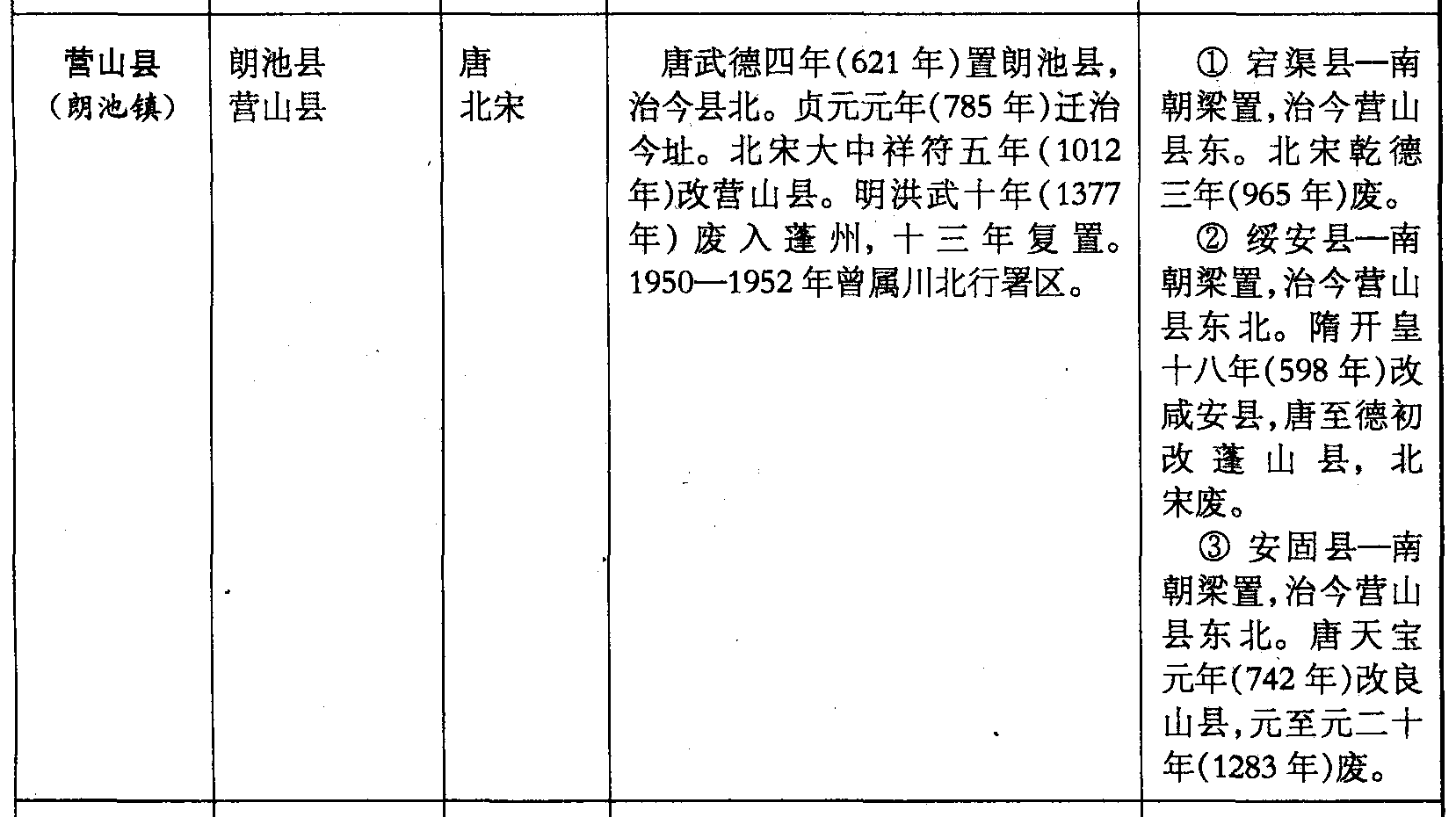 营山县(朗池镇)朗池县营山县唐北宋唐武德四年(621年)置朗池县,治今县北。贞元元年(785年)迁治今址。北宋大中祥符五年(1012年)改营山县。明洪武十年(1377年)废入蓬州,十三年复置。1950—1952年曾属川北行署区。❶ 宕渠县—南朝梁置,治今营山县东。北宋乾德三年(965年)废。❷ 绥安县—南朝梁置,治今营山县东北。隋开皇十八年(598年)改咸安县,唐至德初改蓬山县,北宋废。❸ 安固县—南朝梁置,治今营山县东北。唐天宝元年(742年)改良山县,元至元二十年(1283年)废。