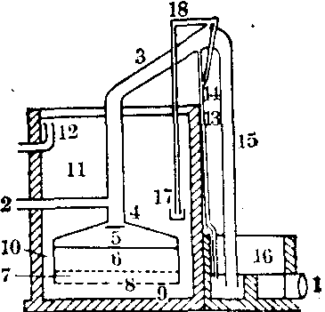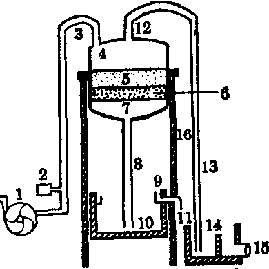 1. 送水泵 2. 凝结剂投加处3. 进水管 4. 挡板 5.滤料6. 承托层 7. 积水空间 8.清水管 9. 溢水槽 10. 冲洗水池 11. 清水出口 12.虹吸上升管 13. 虹吸下降管14. 水封井 15. 反冲洗水排出口 16. 钢筋支架