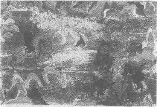 隋,甘肃省敦煌县莫高窟第419窟窟顶东披壁画。此为萨埵本生图的开始部分,三位太子入山狩猎。画面上山石危耸,绿树成荫,太子骑于马上,矫健而潇洒。三位太子各具姿态,或伏于马背,或回首了望,或拉弓待发,皆十分生动。在他们的视野内的几只小鹿拚命狂奔,四肢几乎成直线,展现出小鹿以最高速度的奔跑状。而山的另一边的一只野兽昂首翘尾静立,显示出它正处于安全的境地。此图的景色以粗笔挥洒,具有粗犷、奔放之感。人物、马匹、动物的刻画则线条流畅,设色精美。