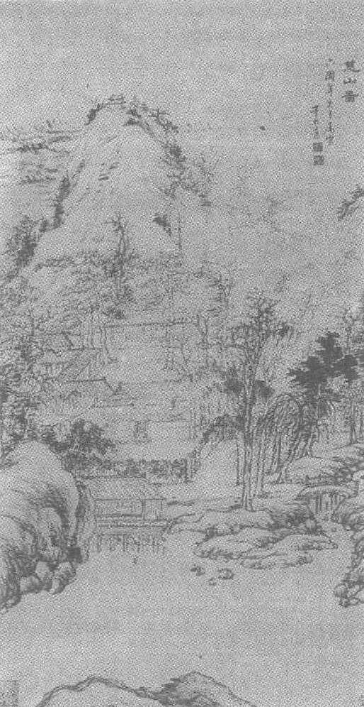 清。董邦达绘。纸本水墨。纵76.8厘米,横40.5厘米。上海博物馆藏。董邦达(公元1699—1769年),字孚存,号东山,浙江富阳人。雍正十一年(以元1733年)进士,乾隆二年(公元1737年)授编修,官至礼部尚书。善画山水,取法元人,善用枯笔,承袭“四王”风规。颇多逸致。亦工书法,篆隶得古法。曾襄助编纂《石渠宝笈》等巨型典籍。此图绘远山高耸,山顶有一亭,山坳间,修竹成林,山麓处,老松偃仰,杂树疏落有致。树丛中掩映房屋数间,一屋内坐有一人,屋舍四周围绕篱笆墙,篱笆墙上缠有藤条。近景水榭临溪,水面上波纹起伏,一木桥横架两岸。山峦岩石作披麻皴,笔墨酣畅,构图严谨,风格苍秀,表现出了浓浓的秋意,意境清幽深远。右上自题“慈山图”。