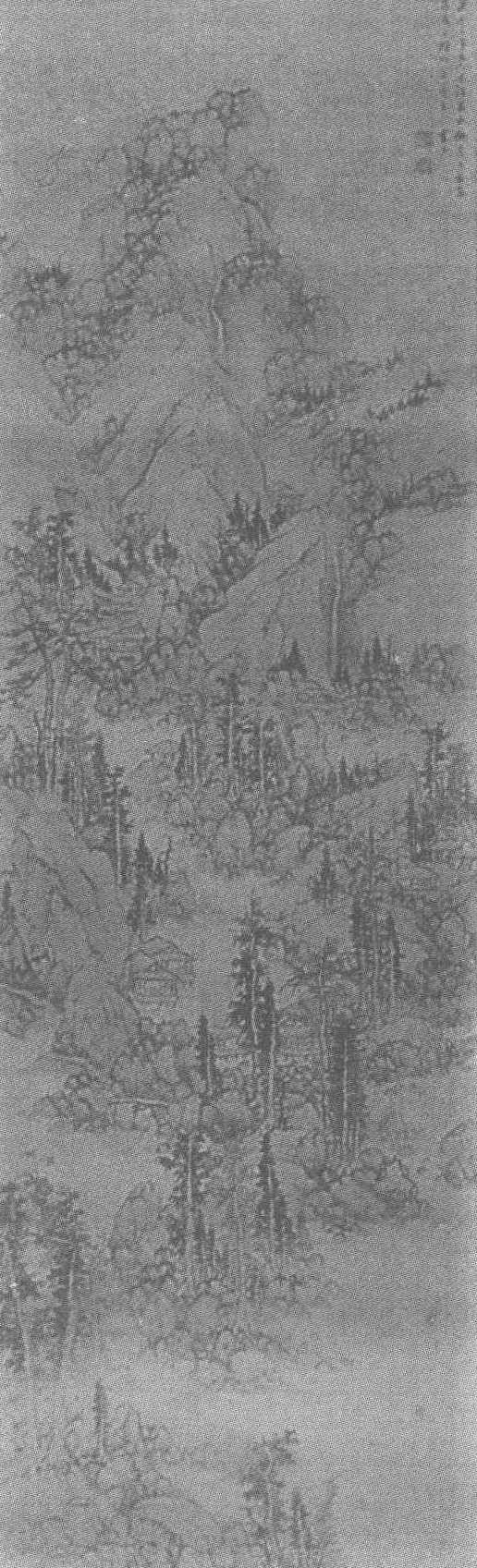 清。蓝孟绘。绢本设色。纵217.3厘米,横68.3厘米。辽宁省抚顺博物馆藏。蓝孟,生卒年不详,约活动于清顺治、康熙年间。字次公、亦舆,又字鸾,名画家蓝瑛之子。钱塘(今浙江杭州)人。山水画师法宋、元诸家,尤得倪瓒疏秀雅逸之致,又仿黄公望山水图。此图系以鸟瞰式角度描绘景物,由远及近依次绘来。远处,重峦叠嶂,危峰高耸,飞瀑如练,直泻而下。中近景处乔木松柏蔚然成林,雄劲挺拔,栋栋房舍屋宇于山势平缓处而建,散布于山野间,富于生机。蜿蜒的溪水上小桥横架,大小碎石形态各异。山脚下的一块坡地上,两位高士坦然而坐,尽情地欣赏大自然精华。图中的山石多作矶头,林木笔墨简朴,构图既有空间感又有纵深感,气韵横贯,是蓝孟绘画作品中的佳作。画右上侧题“康熙三年又六月法黄大痴,画于长安客窗之梧竹交阴处”。