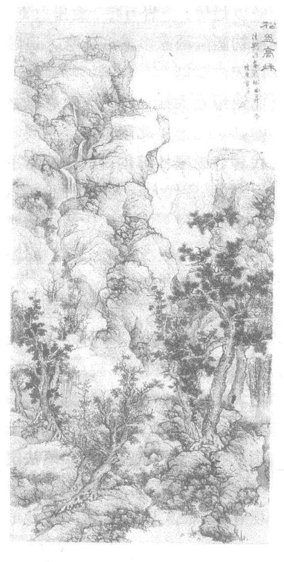 明。蓝瑛绘。绢本设色。纵184.2厘米,横93.9厘米。浙江省博物馆藏。蓝瑛见《蓝瑛仿李唐山水图轴》条目。此幅为作者晚年在杭州横河桥故居城曲茅堂所作:重崖叠嶂,危峙耸拔,如练的瀑布飞流而下。山下松树奇古苍劲,红枫风姿绰约,在萧瑟的秋日里洋溢着勃勃生机。坡堤上,一高士正缓缓地走向山林,其后跟随着一个手捧琴囊的童子。画的右上角,有自题“松岳高秋,法荆浩画于城曲茅堂,蝶叟蓝瑛”,下铃两方印。此图运用勾勒浅绛法,下笔苍老坚劲,“荷叶皴”兼“斧劈皴”的山石形貌跌宕多姿,嵯峨壮观。双勾红叶明洁淡雅,秋意十足。整个画面充满秋的空远清逸,幽静高旷,令人向往。