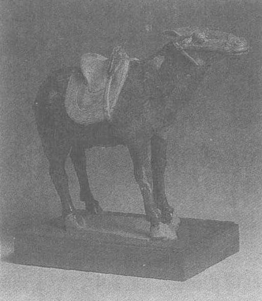 释义 | 古代名物 > 雕繪類 > 雕塑部 > 工藝雕塑 > 藍釉陶驢 藍釉陶驢 lányòutáolǘ 唐代陶塑。公元1956年陝西省西安市小土門出土。高二三·五厘米,長二六·五厘米。四腿直立,昂首伸頸作嘶鳴狀。鞍韉施白釉,蹄露胎,神態逼真。現藏中國歷史博物館。 蓝釉陶驴 蓝釉陶驴唐。高23.5厘米,长26.5厘米。1956年陕西省西安小土门出土。北京中国历史博物馆藏。蓝彩是唐代较为名贵、稀少的颜料。此驴除四蹄外均罩以蓝釉。驴四腿直立于踏板之上,伸颈、昂首,双目圆睁。颈部额前的鬃毛清晰可辨,体态健壮有力。装有辔饰,背上有鞯(衬托鞍的垫子),鞍呈米黄色,靽(后部的革带)、鞅(系于腹部的革带)等装饰俱全。其神态和行为似驮物间隙的稍憩,塑造得十分自然传神。 ☚ 三彩文官俑 褐釉骑驼陶俑 ☛ |