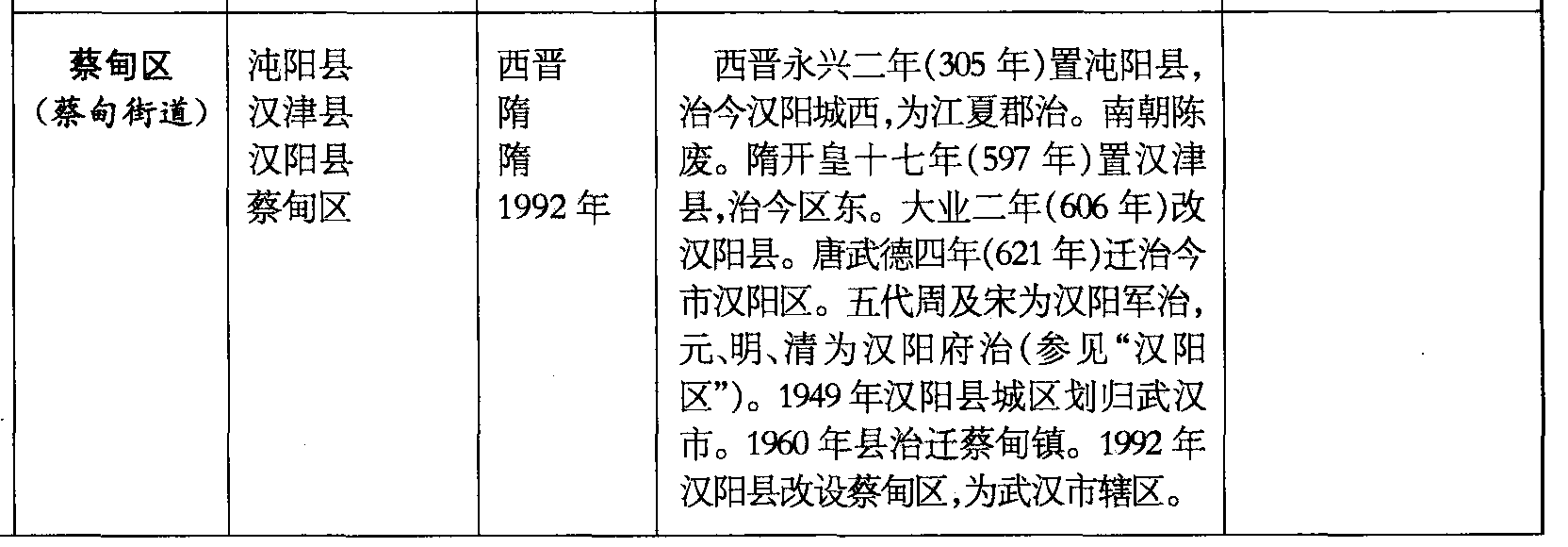 蔡甸区(蔡甸街道)沌阳县汉津县汉阳县蔡甸区西晋隋隋1992年西晋永兴二年(305年)置沌阳县,治今汉阳城西,为江夏郡治。南朝陈废。隋开皇十七年(597年)置汉津县,治今区东。大业二年(606年)改汉阳县。唐武德四年(621年)迁治今市汉阳区。五代周及宋为汉阳军治,元、明、清为汉阳府治(参见“汉阳区”)。1949年汉阳县城区划归武汉市。1960年县治迁蔡甸镇。1992年汉阳县改设蔡甸区,为武汉市辖区。
