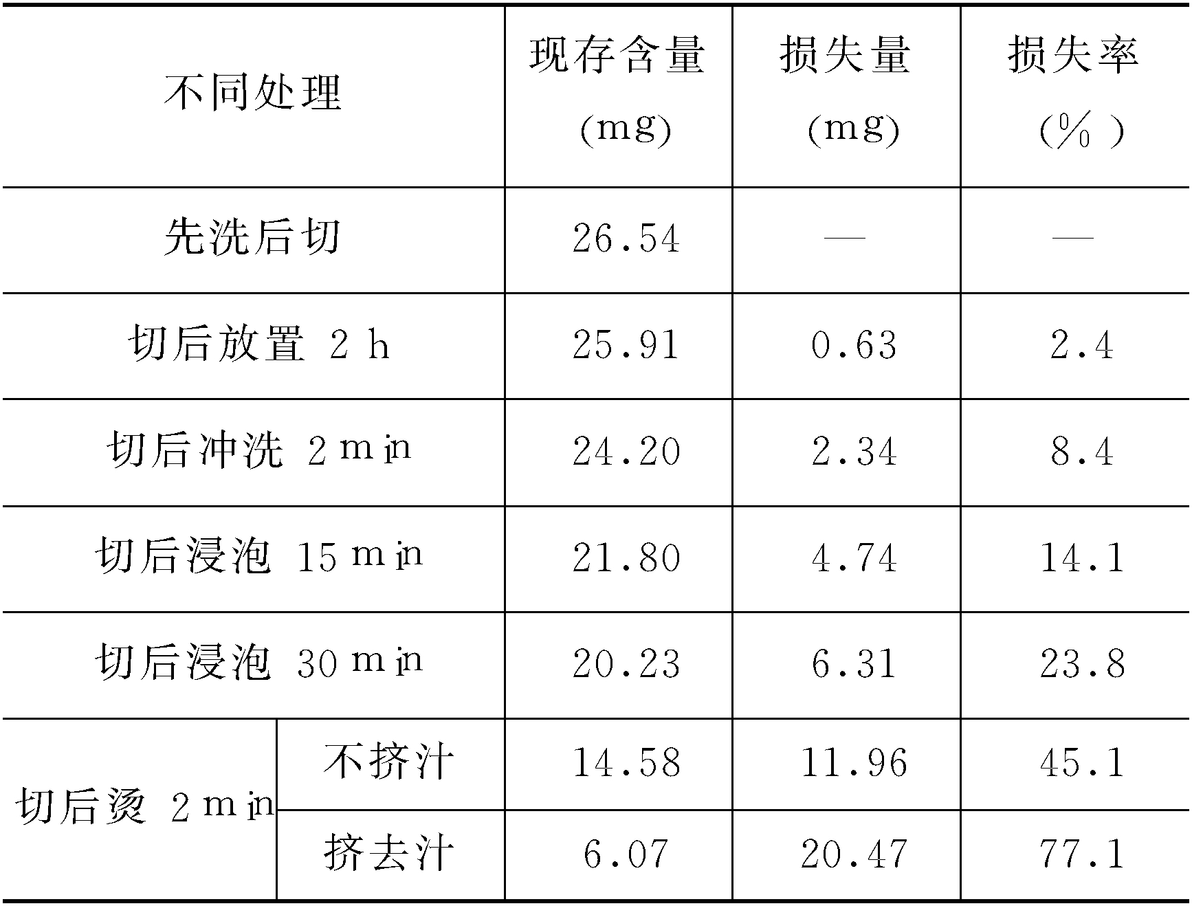 以白菜为例,烹调前不恰当的蔬菜初加工造成维生素C的损失情况见下表(以100g计):