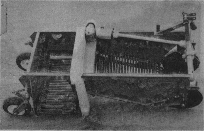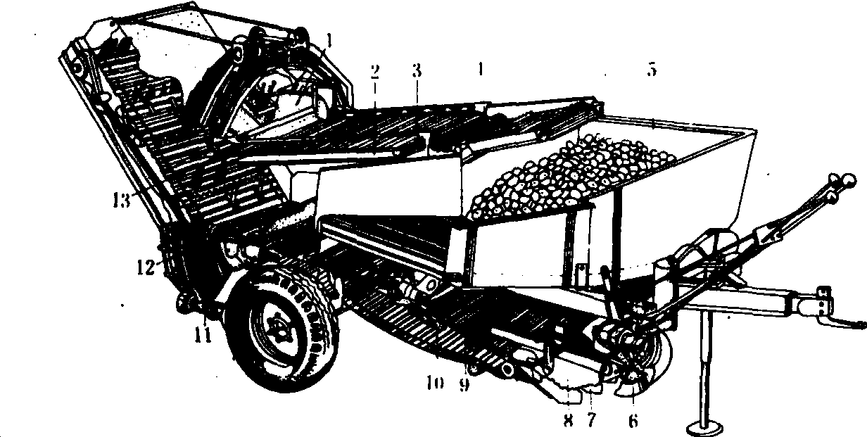 释义 | 薯类收获机械potato harvesting machi-nery收获薯类块茎或块根的机械。多数机型用于马铃薯收获,少数可用于甘薯收获。薯类收获的一般工艺过程为收割茎叶、挖取薯块、分离杂物和清选分级等。19世纪初欧美开始以栅条犁壁的挖掘犁代替手锄挖掘薯块。1856年出现了能把薯块用回转轮抛至一侧的挖抛机。1868年制造出了能使薯块与泥土分离的升运链式挖掘机。第二次世界大战结束后,一次能完成挖掘、分离、清选的联合收获机得到了发展。中国在20世纪50年代后期开始研制薯类挖掘犁和挖掘机,其中甘薯挖掘犁和马铃薯挖掘机在生产中应用较多。 图1 升运链式薯类挖掘机 马铃薯联合收获机 能一次完成挖掘、分离和清选等多种工序。一个行程可收获一行或多行马铃薯,行距在50~70厘米之间,也有90厘米的。主要由挖掘铲、抖动升运链、圆筒筛、杂物分离器和分级滚轴等组成(图2)。工作时限深轮沿着垄面滚动,起限深作用,挖掘铲将挖起的薯块及夹杂物,经抖动升运链的作用,小土块和部分夹杂物从升运链杆间的空隙中漏下,留在表面的薯块及夹杂物经过分离辊进入茎叶输送器。输送器杆条间间隙保证薯块及少量的夹杂物能从杆条中漏下进入圆筒筛。从薯块上被分离辊扯下的茎叶则被输送器抛出机外。圆筒筛的内圆上装有叶板将薯块向上运送至杂物分离器的输送带上,输送带面有许多橡胶针状物,混合物通过时,石块等较重杂物压弯橡胶针,沿带面向下掉到杂物输送器上;薯块较轻,则由橡胶针托住被向上输送,落到马铃薯输送器上,再通过分级滚轴将过小的薯块分离,最后将好的薯块集中在薯箱中。 图2 马铃薯联合收获机 1.杂物分离器; 2.杂物输送器;3.马铃薯输送器;4.分级滚轴; 5.薯箱;6.限深轮; 7.挖掘铲;8.圆盘刀;9.抖动升运链;10.抖动机构; 11.圆筒筛;12.分离辊; 13.茎叶输送器 主要工作部件 有挖掘器和输送分离器。 挖掘器 除了要求高质量地挖掘和输送薯块外,还要求能耗低,不易堵塞和缠草。使用较多的有固定式、振动铲式、驱动圆盘式等。振动铲式常同筛式分离输送器配合使用,可减少阻力。驱动圆盘式除了能减少挖掘阻力外,还能消除塞土和减少薯块的丢失,但结构复杂、价格高,采用较少。 固定式挖掘器多为铲式,其中以三角形铲居多。铲面又分平面、凸面和凹面三种。以平面三角铲结构最简单、运用最广。铲子按工作幅宽度不同,又分为单铲、双铲和多铲。振动铲常采用条形铲。平面固定铲的主要尺寸是升角,通常小于24°,常用15°~22°;刃长小于480毫米,常用350~400毫米;张角(γ)常取40°~50°。 输送分离器 由挖掘器挖出的薯块含有多种杂物如土块、石砾、茎叶和杂草等,尤其是与薯块尺寸相近的土块、石砾,要将它们与薯块分离开来,难度较大。目前采用的输送分离器形式主要为:升运链式、振动筛式和圆筒筛式。 升运链式输送分离器由两条平行的链条、抖动机构及主被动链轮组成。在两链之间每隔一定间隔(26~31毫米)安装一钢制的杆条,组成栅筛(有的机器上把杆条两端弯成钩状,互相连接代替链条),使小杂物从杆条中漏下,薯块和大夹杂物则送至后续分离器上。输送器的抖动机构产生周期性振动,用来强化分离能力,帮助破碎土壤。最简单的抖动机构是椭圆形的托链轮,其长短径之比大于1:2.5。也有用曲柄连杆驱动的抖动轮,在潮湿土壤条件下能使分离能力显著增强。 升运链式输送分离器由于结构简单,分离能力和输送能力强(在倾角30°时尚能输送),而被普遍采用。但金属用量大,磨损快。一些生产厂用高强度橡胶带来代替链子,可延长寿命,减少噪声。或在杆条上加装橡胶保护层,减少薯块损伤,但橡胶易粘土。亦可用塑料保护管。输送链常用的线速度为1.6~2.0米/秒。 振动筛式分离输送器由曲柄连杆机构驱动作往复运动。筛子由纵横杆条组成,常与振动铲联动。特点是分离能力强,但易堵塞。常用的参数为:筛子倾角10°~20°,曲柄半径20~30毫米,转速450~650转/分,吊杆安装角30°~35°。物料移动速度0.6~1.0米/秒。 圆筒筛式输送分离器常作后续分离用,由钢条制成栅格式转筒,圆筒的内壁处,每隔一定间距装有叶板。小于薯块的夹杂物在转简旋转时通过栅格漏下,而薯块则被旋转的叶板提升至一定高度后落到后续装置上。这种分离器可靠性好,能量消耗少,平稳。但金属用量大,分离能力差。土壤潮湿时易堵塞。圆筒筛直径为2.0~3.0米,长1~2米,转筒的圆周速度0.5~1.2米/秒。 发展趋势 主要是减少损失和提高分离效果。减少损失的措施如利用帆布输送器装卸薯块;用自动调节卸载高度的输送器以适应各种运输车,达到最低卸载高度,和加装捡拾部件收集散落在地上的薯块等。在改进分离效果方面的措施有:分离装置结构尽量增大分离面积;增加茎叶分离装置和采用半自动剔选输送带等。在新的部件研究上如研究高频低幅的振动筛,在块茎损伤最小的振动频率下工作;利用光电挑选系统、红外线电磁交替作用系统来剔除损伤的块茎和用扫描式和电一气动分级和选别系统等。使剔选分级从凭目力和手工作业发展到半自动和全自动剔选装置。 薯类收获机械potato harvesting machinery主要收获马铃薯的机械。种类很多,有的只能挖出薯块,有的能同时分离泥土、清理夹杂物和收集薯块。这种机械按其所完成的工序,分别有挖薯机、抛掷式挖薯机、升运式挖薯机及联合收获机等。 |