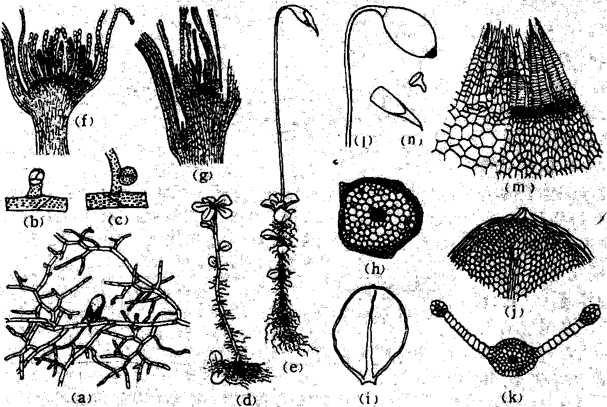 提灯藓 (a) 原丝体; (b) (c) 原丝体上配子体的形成; (d) 雄配子体; (e) 雌配子体(具孢子体); (f) 雄株顶部,示精子器; (g) 雌株顶部,示颈卵器;(h) 茎横切面; (i) 叶; (j)叶顶部; (k) 叶横切面; (1)孢子体;(m) 蒴齿; (n) 孢子