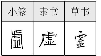 ❹ 避实击虚|避实就虚|乘隙捣虚|持盈守虚|故弄玄虚|批亢捣虚|深藏若虚|作贼心虚|作贼心虚|做贼心虚 虚xū小篆上为“豦”(省)为音符,下为丘。本指能藏龙卧虎的大山。《说文》:“虚,大丘也。昆仑丘谓之昆仑虚。”《诗·傭风·定之方中》:“升彼虚矣,以望楚矣。”本义失。现为“实”的反义词,属假借。作声符生成的字有: xū 墟(废墟) 嘘(吹嘘) 歔(歔欷) qu 阴平:觑(觑觑眼) 去声:觑(面面相觑) 相关链接 墟,省作“虚”。《周礼·小司徒》:“九夫为井,四井为邑,四邑为丘。”丘谓之“虚”。此“丘”与丘陵的“丘”概念内涵不同。“虚”即“墟”。 虚虛xū(11画)