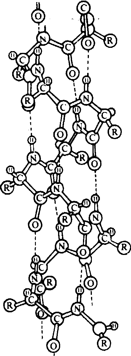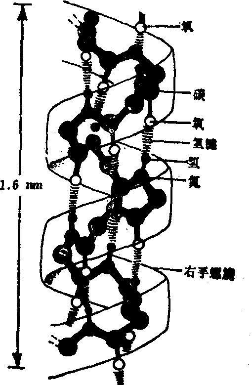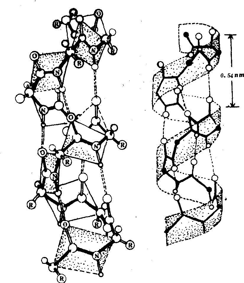 两个分子氨基酸缩合的产物称二肽。以肽键连接的多个氨基酸称多肽。多肽的主链为重复的—CO—NH—CH—,多肽的两端仍具自由的氨基和羧基。书写时通常以左侧表示氨基末端,称N-末端,以右侧表示羧基末端,称C-末端。各氨基酸残基α碳原子上的侧链(-R)的性质和相对比例在很大程度上决定着多肽的化学性质。蛋白质由一条或多条庞大的多肽链组成,因此,根据各种氨基酸残基的数目和排列顺序构成大量不同类型的蛋白质。据估计生物界不同类型的蛋白质总数约1010—1012种,假定20种氨基酸在多肽链中各出现一次,那么,可能出现的排列方式将有2020种之多,若再加上每种氨基酸在多肽链中的重复出现,蛋白质的数目将更惊人。 除构成蛋白质的多肽外,还有具特殊生理功能的各种小分子肽,如下丘脑分泌的促甲状腺释放激素即为一种三肽,有促进脑垂体合成和释放促甲状腺素的功能。另外,广泛存在于细胞中的谷胱甘肽也是一种三肽,是某种酶催化反应的辅助因素。血管舒缓激肽是一种九肽,有降低平滑肌张力的作用。 蛋白质的构象 构象是指组成分子的原子基团围绕共价键旋转而形成的不同空间排布(三维空间形状)。多肽链中有许多共价单键,原子基团围绕它们自由旋转,理论上能够自发地形成大量不同构象,但实际上每种蛋白质仅有一种构象,其主要原因在于多肽链中侧链基团之间以及与水分子之间形成非共价键,使之不能作自由旋转。所以蛋白质的构象决定于分子本身氨基酸残基的顺序和排布。构象的改变不包括化学键的断裂,也不改变手型。 通过X射线衍射技术,目前已经完成200余种蛋白质结构的分析。每种蛋白质都有特殊的构象,但在这些大分子中往往有共同的重复出现的折叠,使分子呈现有规律的螺旋或片层状稳定构象。它们是由多肽链分子内部位置相近的氨基酸残基之间互相结成氢键而形成的。 α-螺旋结构 多肽链主链呈螺旋式卷曲,每隔3.6个氨基酸残基卷曲一圈,组成右手螺旋体,简称α-螺旋。这种构象是由肽链中每一螺旋中的羰基 一螺旋中的亚氨基 结成氢键而产生的。氢键的走向与α-螺旋体的长轴平行,各氨基酸残基的侧链伸向螺旋的外侧(图1)。α-螺旋的形成受多肽链中侧链基团的大小和性质的影响,例如多聚异亮氨酸侧链较大,造成定向障碍,使α-螺旋的规律性受阻。又如多聚脯氨酸侧链与主链α-碳原子形成吡咯环,肽链不具亚氨基而不能形成氢键,多肽链中只要有脯氨酸(或羟脯氨酸),α—螺旋即被中断。β-折叠层结构 这种结构的模式是多肽链以走向相反但排列平行的方式在主链中邻近的羰基与亚氨基之间形成氢键,氢键与肽链的长轴垂直,分子基本上位于同一空间平面。由于肽链本身並未充分伸展,所以从主链的一个侧面观察,链呈连续的“Z”型折叠或呈锯齿状。每个氨基酸残基的侧链则伸向折叠层的上、下方,这种构象称为 β-折叠层(图2)。在球蛋白中肽链的走向包括逆行和顺行两种方式,氢键可在同一肽链的不同部分产生,也可在不同分子之间形成。如果多肽链中侧链基团过大,並带相同电荷,也影响β-折叠层的产生。β-折叠层是构成球状蛋白质的网架。