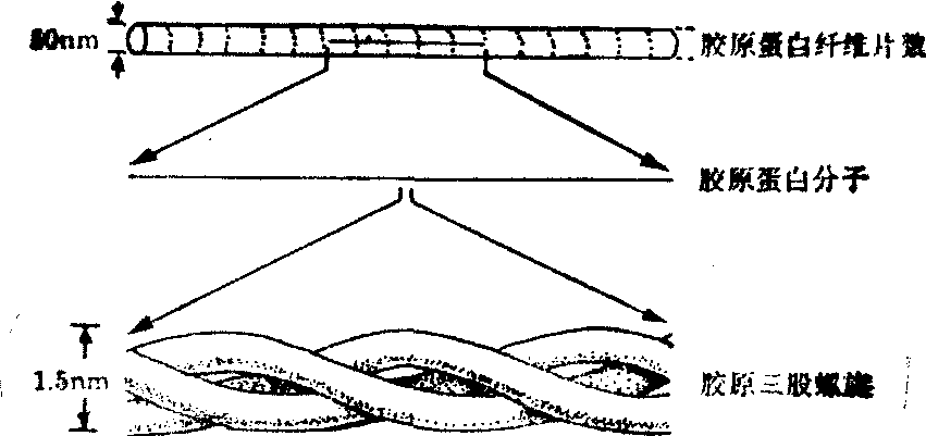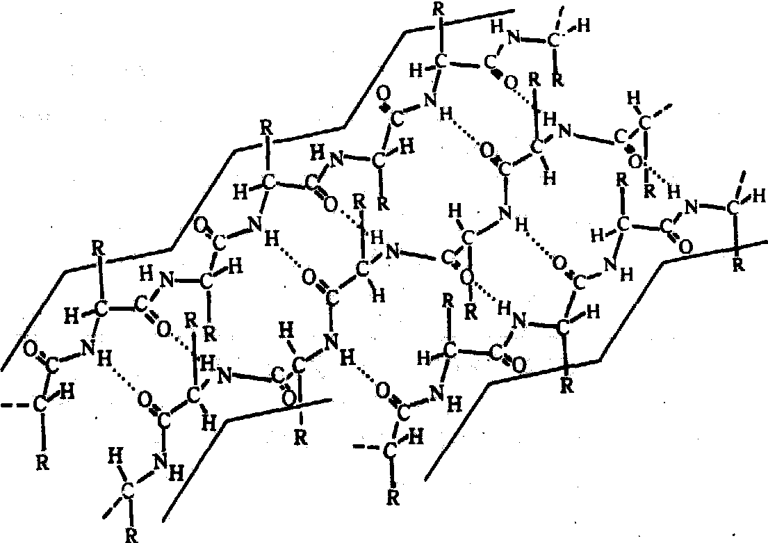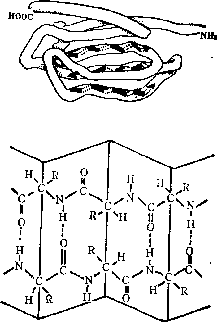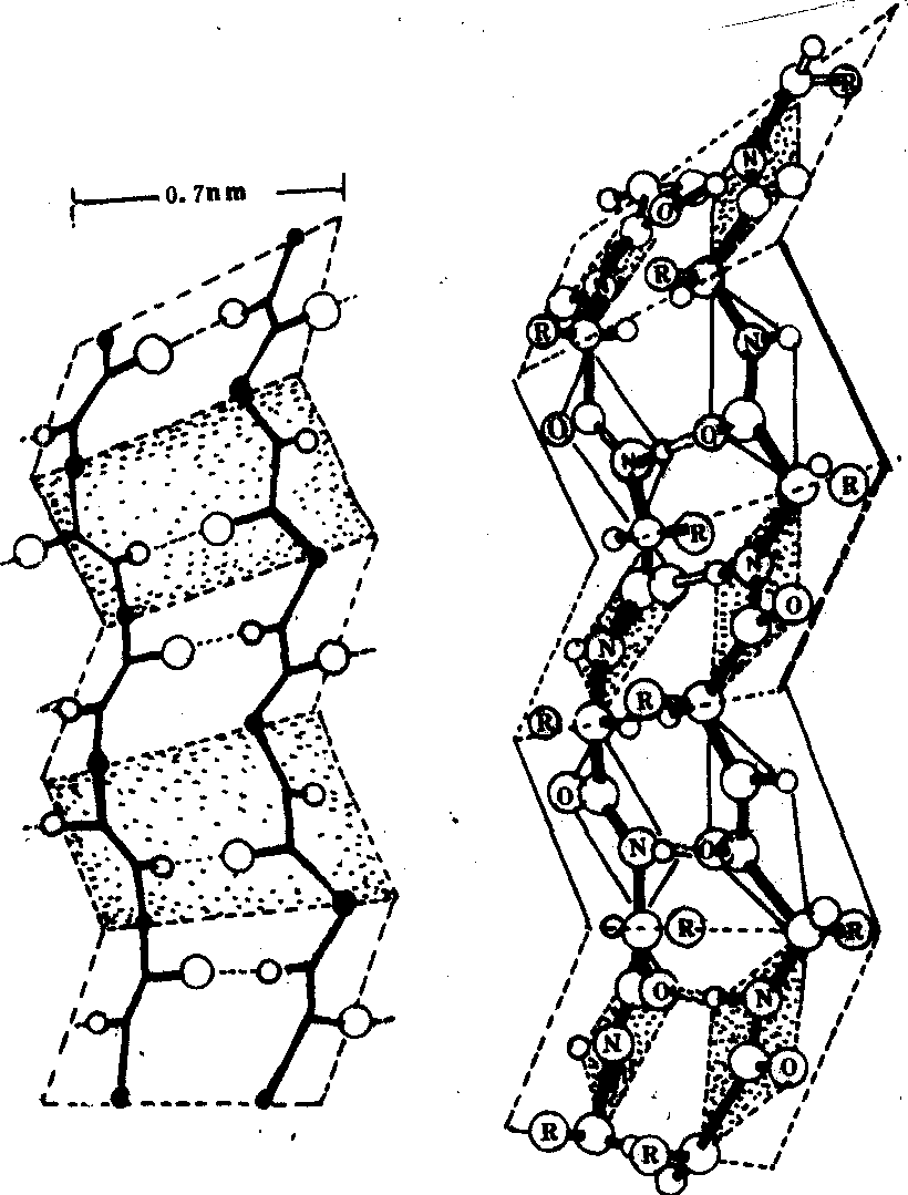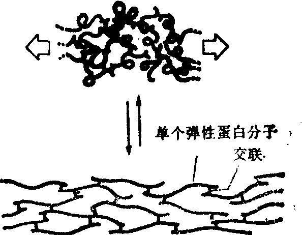 图2 多肽链的β-折叠层模型 蛋白质结构的多样性 多肽链中各种不同氨基酸残基的顺序及其侧链基团的不同性质,赋予各种不同蛋白质独特的结构和功能。细胞间隙中的胶原蛋白是由三条多肽链构成,每条链都富含脯氨酸,而且在氨基酸残基序列中每第三位都是甘氨酸,三条链互相缠绕成规则的三股螺旋,构成一个胶原蛋白分子。相邻的分子以其赖氨酸残基间的共价键交联,聚合成纤丝,再继续聚合、包扎构成结缔组织中的胶原纤维。由于脯氨酸或羟脯氨酸分子含吡咯环,只有甘氨酸才能形成氢键,所以胶原蛋白中含脯氨酸越多,氢键越少。这种特殊的分子结构,使胶原蛋白无弹性而有较强的抗拉强度(图3)。胶原蛋白一旦形成便不再更新,随年龄的增长,可还原性的交联键逐渐减少,使蛋白质分子发生缓慢地渐进性变化,可视为生物学年龄指标之一。胶原蛋白老化而引起的疾病称胶原病,例如类风湿性关节炎的骨质变化,眼晶体的混浊(白内障),都与胶原蛋白的异常沉积或分子结构变化有关。 弹性蛋白也是一种存在于细胞以外的蛋白质,是由许多无定形的肽链以共价键相互交联而构成的网络结构,富弹性。每条肽链可分为两个区段: ❶近C—末端为富含丙氨酸和赖氨酸的区段,有赖氨酸在肽链之间可以发生交联作用。这一段肽链主要呈α-螺旋。 ❷另一段为富含甘氨酸、脯氨酸和缬氨酸区段,有重复的四肽、五肽和六肽,已知四肽经β转向可形成较宽的螺旋,这一区段控制着蛋白质分子的伸展性。如受到张力时,分子可伸延,张力去除时又可恢复原状。例如肺组织和动脉可以改变形态,但组织不受损伤(图4)。