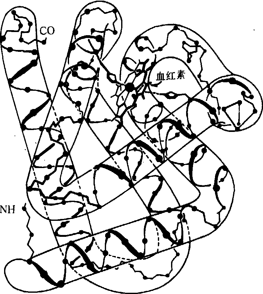 图4 弹性蛋白示意图 球蛋白的结构也是由多肽链折叠而成的。其侧链的极性基团和非极性基团的分布,是控制多肽链折叠的重要因素。许多疏水侧链向分子内部集中,以避免与水环境接触,而极性基团则伸向分子表面,有利于与水或其他极性基团结合,所以球蛋白有高度的表面活性,各种不同的酶、抗体、某些激素和许多有转运功能的蛋白质几乎全部为球状蛋白质(图5)。