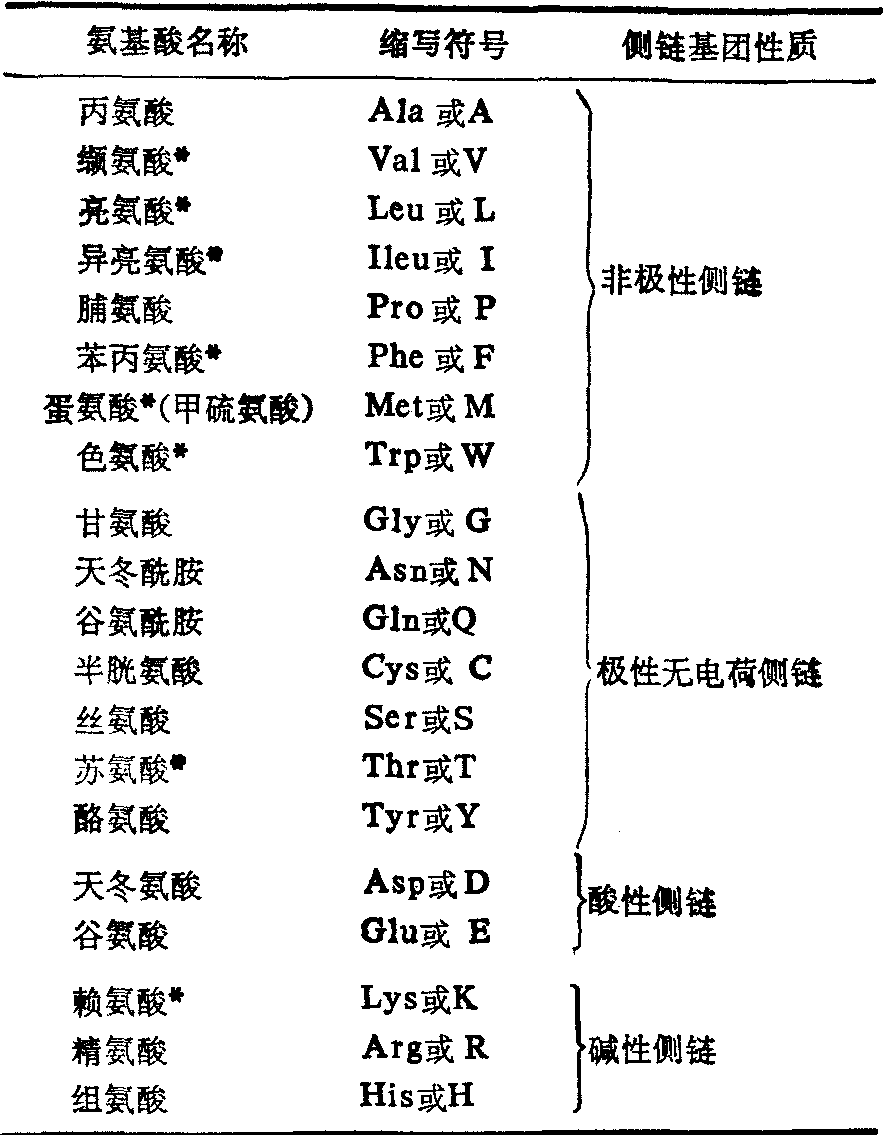 R为α-碳原子上的侧链基团。除甘氨酸的R基团为H原子外,全部氨基酸的R基团或为羟基 (-OH)、羧基(-COOH)、巯基(-SH)、氨基(-NH2),或为烃基(-CH2)、(—CH=)不等。R基团的性质决定氨基酸的性质,蛋白质分子中氨基酸的种类、数目及其分布又决定蛋白质的类型、结构和功能。在20种氨基酸中因R基团的不同可分为非极性和极性两大类。非极性氨基酸R基团在溶液中呈中性,难解离,为疏水性;极性氨基酸在溶液中易解离,其中又因R基团所带电荷不同而分为: ❶极性无电荷氨基酸; ❷带正电荷的碱性氨基酸; ❸带负电荷的酸性氨基酸(表)。此外尚有少数罕见氨基酸,如β-丙氨酸和γ-氨基丁酸(脑组织中发现)。鸟氨酸和瓜氨酸为氨基酸代谢的中间产物,其他如二碘酪氨酸、甲状腺羟脯氨酸、羟赖氨酸等均为氨基酸的衍生物。 除甘氨酸外,全部氨基酸的α-碳原子与四个不同的基团相接,因而不具对称性,可形成左旋(L-型)和右旋(D-型)两种光学异构体,一般蛋白质所含的氨基酸均为L-型。但有少数D-型氨基酸,如D-谷氨酸在许多细胞的细胞壁中也有发现。 氨基酸的性质:氨基酸分子兼有氨基和羧基,于水溶液中离解为-NH+3和-COO-两种离子。在酸性较强的溶液中,羧基解离受抑制,氨基酸带正电荷; 在碱性较强的溶液中,氨基解离受抑制,氨基酸带负电荷。在一定的pH下氨基酸正、负离子解离的趋势相等,溶液呈中性,该pH值称等电点。这种兼性离子特性使蛋白质在体液的缓冲系统中起重要作用。