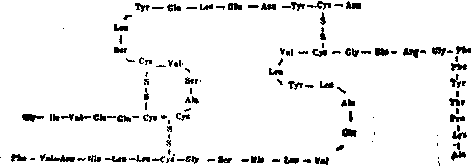 图5 球蛋白示意图 蛋白质结构的层次 蛋白质一级结构 一级结构是指蛋白质分子中各种氨基酸残基按一定顺序排列构成的多肽链骨架。其内容有: ❶多肽链的数目; ❷每条多肽链中氨基酸的数目、种类和顺序; ❸链内二硫键的位置和数目; ❹链间二硫键的位置和数目。蛋白质的一级结构即蛋白质的共价结构(图6)。根据胰岛素的一级结构,中国于1965年首次成功地合成了具有生物活性的结晶牛胰岛素,为人工合成蛋白质做出了重要贡献。 某些遗传性疾病直接与蛋白质一级结构异常有关。例如人的血红蛋白含四条多肽链: 两条α-链,两条β-链。镰形细胞贫血症患者血红蛋白的一级结构,仅仅在β-链第六位的谷氨酸被缬氨酸所取代。谷氨酸为亲水氨基酸,缬氨酸为疏水氨基酸,这一改变使血红蛋白分子的溶解度下降,在氧分压低时,分子间易于聚合,沿一个轴形成聚合体,使细胞变成镰刀形,难以通过微循环,在肝和脾组织中易阻留。同时这种血细胞脆性增高,因而造成溶血性贫血。已证实是由于蛋白质的基因突变导致的后果,这类疾病又称为分子病。