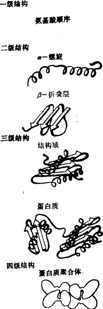 图7 蛋白质结构层次示意图 稳定蛋白质三级结构的键: ❶氢键:是指分子中氢原子与负电性较强的氧原子之间相互吸引而形成的非共价键,是一弱键,易断裂。 ❷离子键:肽链侧链基团解离的阴离子和阳离子相互吸引形成的键,也称盐键。多分布在分子表面,亲水性强,使蛋白质分子易溶于水。对于维持蛋白质的空间结构作用较小。 ❸疏水键:又称非极性键,由蛋白质侧链上非极性基团相互吸引而形成的键。这些基团在蛋白质分子中有向内部聚集以脱离表面水溶液的性质,是稳定三级结构重要的键。 ❹二硫键: 是指蛋白质分子中两个巯基(—SH)之间氧化生成的共价键 (—S—S—)。这种键结合牢固,对维持蛋白质分子空间结构有重要作用。在物质的聚集态中,分子与分子之间有一种较弱的吸引力,称范氏引力。 蛋白质四级结构 四级结构是指蛋白质分子中两条或多条多肽链之间以一定方式聚合而成的空间结构。每条多肽链作为一个亚基,以其表面的氢键、静电吸引、盐键等维持结构的稳定。亚基之间无共价键,各亚基单独存在多无生物活性。构成蛋白质的亚基有的相同,有的不同,因不同的蛋白质而异。例如过氧化氢酶含四个相同的亚基,血红蛋白则含两条α-链和两条β-链,免疫球蛋白含两条重链(H)链和两条轻链(L)链。各种亚基之间以非共价键联合,组成超分子结构——聚合体的过程也称为组装。例如酶复合体、核糖体、蛋白质纤丝、病毒和膜等都是蛋白质组装的产物。两个亚基在同一结合部位互补,可形成二聚体。二聚体又常作为亚基建造更大的聚合结构。许多亚基可连成链状或环状多聚体。 由球状肌动蛋白分子组装的肌动蛋白纤丝即属此例。蛋白质各亚基之间以六角形排列也可组成平面的多聚体,特异的膜运输蛋白质有时即以这种方式位于脂质双层中。各亚基在几何学上稍有变化,平面的多聚体则可卷成筒状或管状。某些病毒的蛋白质外壳即筒状多聚体。环状、管状或球状等封闭的聚合体结构,使蛋白质各亚基之间键的数目有所增加,可加强结构的稳定性,如病毒外壳蛋白兼有保护内部核酸分子的作用。 另一种更为复杂的大分子聚合体为细菌的核糖体,它们包括55种不同的氨基酸和3种RNA分子。假如将这些单独的成分在适当条件下共同培育,可组装成原来的结构,並具有进行蛋白质合成的功能。 蛋白质的组装与细胞各种生理功能的体现有极密切的关系。至于组装过程中如何精确调节目前尚不了解。 蛋白质的变性 某些物理、化学因素(如高温、强酸、强碱、射线等)破坏蛋白质多肽链的天然折叠而失去其原有理化性质以及生物学活性的变化,称为蛋白质变性。绝大多数蛋白质仅在一个很窄的温度、pH范围内保持生物学活性,如果超出这些范围,蛋白质的性质即受到影响。最明显的变化是溶解度下降,如果处理条件相对温和,多肽链中的共价链未裂解,一级结构保持完整,当去除引起变性的条件时,蛋白质仍可恢复原来的构象和活性,这种过程称为复性。例如核糖核酸酶用尿素及胍处理后,二硫键被还原,氢键断裂,肽链折叠不能保全,催化功能随之丧失。如果经过透析去除处理条件,巯基缓慢被氧化,恢复二硫键,氢键自动产生,多肽链又恢复到原来的折叠状态,酶的催化活性也随之复原。如果处理条件强烈,往往使变性后的蛋白质不能复性,加热处理蛋白质,当温度升高到60—70℃以上时,绝大多数球状蛋白质发生不可逆的变性,卵清蛋白加热后形成不溶解的凝块即属此例。同样,其他条件下只要破坏其天然构象到不可恢复的程度,其生物学功能也随之消失。 蛋白质的分类和功能 蛋白质种类非常多,每种蛋白质都有相应的生物学功能。由于蛋白质结构和功能的复杂性,目前尚无统一的分类标准。从化学组成上一般可将蛋白质分为两大类: 单纯蛋白质和结合蛋白质。前者经水解基本上仅产生氨基酸,后者水解后除产生氨基酸外,还含有机或无机成分,这些成分称为辅基。根据辅基的不同,结合蛋白质又可分为许多种,如核蛋白、糖蛋白、脂蛋白、磷蛋白以及金属蛋白等。按照蛋白质的结构形状可分为球状蛋白质和纤维状蛋白质。球状蛋白质为高度折叠盘绕的分子,溶于水,呈胶状,功能活跃,各种酶和某些有运输功能的蛋白质载体都是球状蛋白质。纤维状蛋白质则结构较坚韧,不溶于水,多作保护或支持结构。根据蛋白质的功能可将蛋白质分为以下几大类: 酶类 是蛋白质中最重要的一类,功能上有高度的特异性,催化有机体全部的化学反应(见“酶”条)。 贮存蛋白类 储存各种氨基酸,为发育提供营养,如卵中的卵清蛋白,乳汁中的酪蛋白,小麦种子中的麦醇溶解蛋白等。 运输蛋白类 具有转运功能,如血浆中的脂蛋白,在小肠、肝和脂肪组织之间转运脂类;脊椎动物红细胞中的血红蛋白,转运氧至组织细胞。 收缩蛋白类 是运动系统的基本成分。例如肌动蛋白为长丝状蛋白质,由许多球形的多肽纵行排列;肌球蛋白为长杆样分子的聚合体,由两股螺旋互相缠绕的多肽链组成,在肌组织中两者平行排列,收缩时互相滑行。 防御蛋白类 对机体有保护和防御功能。例如,凝血酶与纤维蛋白原参与的血液凝固作用,可防止失血。最主要的保护性蛋白质为免疫球蛋白(抗体),它们与侵入血液或组织的外源蛋白质相结合构成一套特异的抗原一抗体反应系统,可保护有机体免受损伤。 激素蛋白类 是