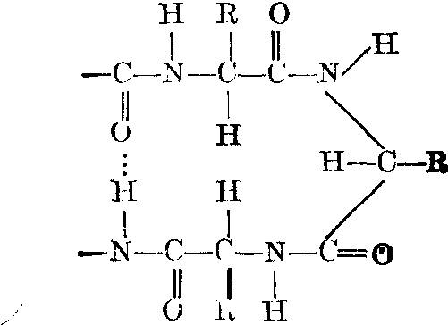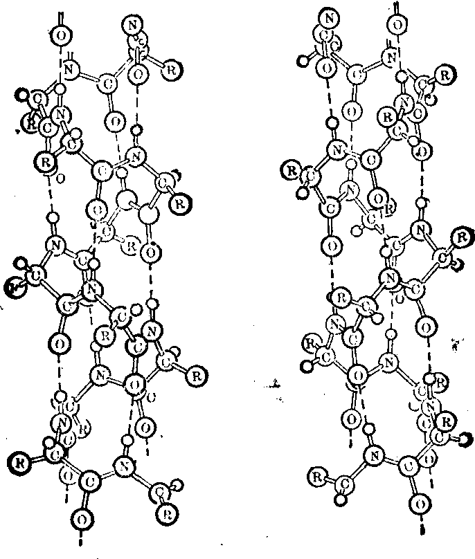 图1 α螺旋的结构图 有两种螺旋,一种是左手螺旋,一种是右手螺旋。从主链看两者是镜面对称的。但侧链的方向不同,相互不完全是镜面对称。在蛋白质中以前报道只发现右手α螺旋。1978年,Roche和Veerdouw在嗜热菌蛋白酶的晶体结构中发现第226~229位残基成左手α螺旋。这是迄今所报道的唯一的左手α螺旋。 早期研究羊毛等角蛋白的X射线衍射图时,英国学者设计了许多模型来解释衍射点,所有这些模型中跳不出整数的概念,即螺旋每上升一圈所包含的残基数是整数。用这种模型产生的衍射点都与角蛋白的衍射花样有距离。此时,美国科学家L. Pauling在精确的键长键角数据的基础上,冲破了整数的概念,作成了每3.6个残基上升一圈的螺旋模型,准确地解释了衍射点。但按照Pauling的模型,每个残基沿轴向上升1.5A,应该有相应的衍射点,而这一衍射点在以前是没有被人所注意的。Perutz在箭猪毫毛的X射线衍射图中找到了这一衍射点,Pauling的α螺旋经受住了考验。在球状蛋白质中存在α螺旋开始是由杨人济和Doty用旋光法加以证明的。后来,在蛋白质晶体结构中“看”到了它。 除图1表示的典型α螺旋之外,还存在着许多非典型的螺旋结构。为了表达这类螺旋结构,规定了一种表示的方法: “ns”。其中n是螺旋每上升一圈的残基数,s是形成一对氢键的O与N两原子间参与共价结构的原子数。如典型的α螺旋中,O与N之间(包括O与N)共有13个原子,如下: