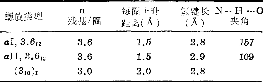 不典型的螺旋如310在蛋白质中也常有发现。此外,在蛋白质晶体结构中发现有另外一种3.613螺旋,它与典型的α螺旋有所不同。典型的α氢键N、H、O三原子处在一直线上,或者与直线偏离不远。 但在非典型的3.61 中,上述三原子距直线甚远,这样的螺旋从能量看与典型的α相差不大,但要继续形成第二圈螺旋就不可能了。因此在有很多圈螺旋的α结构中,末端一圈螺旋经常形成上述非典型的3.613,如肌红蛋白、胰岛素以及溶菌酶中都有这种例子。这种非典型的α螺旋称为α11,相应地称典型的α螺旋为a1,各种螺旋的重要参数见表。不同螺旋的参数