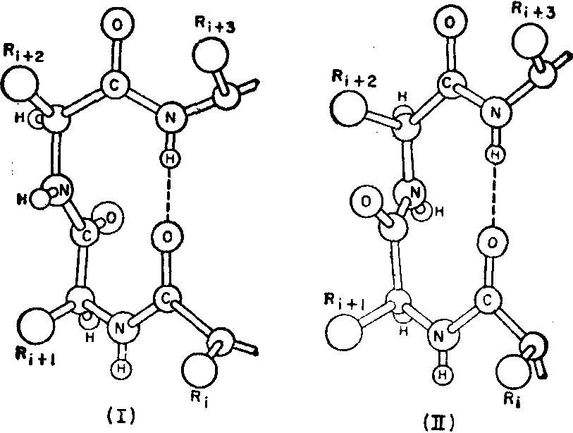胶原螺旋 胶原的功能主要是保护,它的结构与一般的蛋白质不同。它们的一级结构是隔三个残基近似地重复一次,可以表示成(Gly,Aaa,Bbb)n,第二个残基Aaa中最常出现的是丙氨酸或脯氨酸。从立体看,三条胶原肽链绞合成一个分子。形成这种螺旋时,三条肽链的残基间有一个配对关系。每一条肽链以左手螺旋盘曲,每三个残基盘一图。这个残基的侧链只有一个氢原子,因此体积很小,可靠近三重轴。因此三股螺旋能绞得比较紧。 β折叠 是一种肽链相当伸展的结构。它依靠两条肽链,或一条肽链内的两段肽链之间的C=O与N—H形成氢键而成。两段肽链可以是平行的,也可以是反平行的。前者两条链从“N′端”到“C端”是同方向的,后者是反方向的。从能量看,以反平行为更稳定。 在蛋白质中发现有三段以上的肽链相互并排形成β折叠的。也有只有单独一段肽链伸展为β折叠的,此时称β结构。在蛋白质中出现的β折叠有各种方式的组合,形式十分多样,正反平行也能相互交替。 β转角 蛋白质分子中肽链常会出现180°的回折,在这种肽链的回折角上,就是β转角的结构。如何定义β转角,各家还有些分岐,名词也不统一,如U形转折、链回转、发夹结构等都有人使用,现在逐渐统一为β转角。从结构要素看,有一共同点,就是第一个残基的C=O与第四个残基的N—H形成氢键。 β转角的种类比较复杂,粗分可以有图2所列两种,各称为βⅠ与βⅡ,主要差别是图中Ri+1与Ri+2两个残基间的肽键的空间位置不同。但经分析蛋白质中各种β转角后,许多作者指出可以有十几种β转角。有意思的是其中有一些类别并不需要在1→4残基间形成氢键。可能在蛋白质分子中,有远距离的力在维系整个分子的构象,这些β转角因这种力而得到稳定。