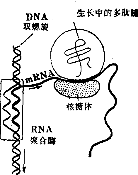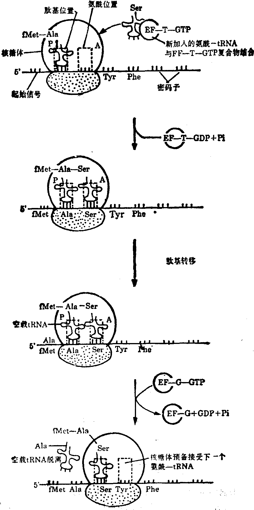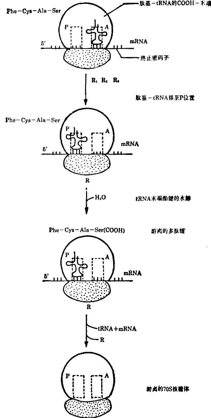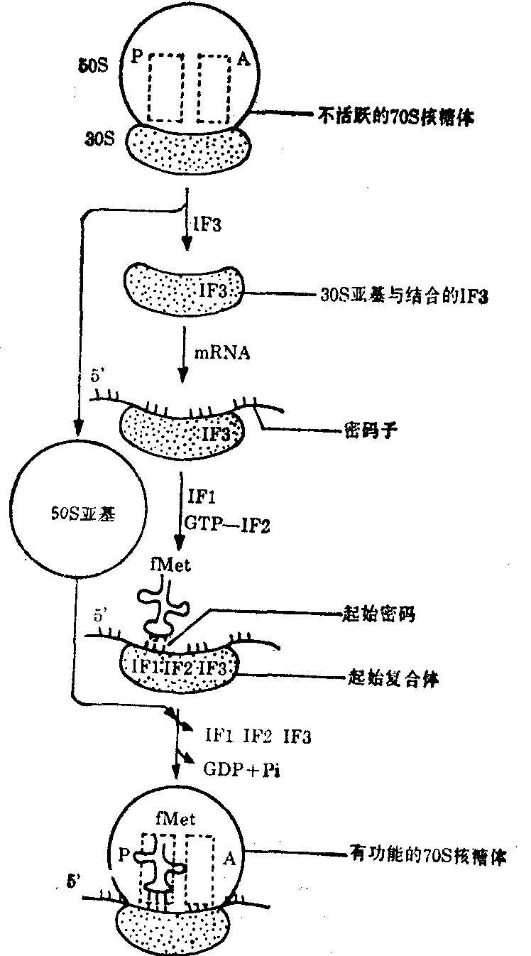 各种生物蛋白质合成的机制十分相似。有关蛋白质合成的知识主要是从大肠杆菌 (E.coli) 和网织红细胞的离体系统研究得到的。现以前者为例将蛋白质合成步骤分述如下。 多肽链合成的起始 蛋白质合成时,70S核糖体处于不断地解离和重聚的平衡中。多肽链合成开始前,70S核糖体必须先解离成50S和30S亚基。起始氨酰—tRNA不能直接和70S核糖体结合;它必须先和30S亚基结合,然后才能再和50S亚基结合。这是一个十分复杂的过程,需要有三个特殊的可溶性蛋白质,称为起始因子(简称IF—1,IF—2,和IF—3)参加; 它们的分子量分别为9000、65 000和21 000。 30S亚基先和IF—3结合,再依次与mRNA、IF—1结合,形成一个复合物。起始氨酰—tRNA先和IF—2、GTP结合形成一个复合物,再加入到上述30S亚基复合物,形成所谓的起始复合物。此起始复合物再同50 S亚基结合,恢复一个完整的有功能的70S核糖体。在这一过程中GTP水解成GDP和Pi,以供应所需的能量;三个起始因子(IF—1,IF—2和IF—3)也从核糖体上解离下来,再循环使用(图2)。 图2 起始复合物与有功能的70 S核糖体(大肠杆菌)的形成复合物 原核生物的起始密码子AUG编码N-甲基甲硫氨酸,而真核生物则编码甲硫氨酸。起始过程要求保证携带着起始氨基酸的tRNA能准确地结合到核糖体的肽基P部位,并与起始密码子AUG配对,使mRNA翻译能正确地进行。mRNA密码阅读是从5′端到3′端进行的。因此,核糖体的P和A部位应能识别mRNA链的方向性。 肽链的延伸循环 当起始氨酰—tRNA结合到P部位,与mRNA密码配对,下一个氨酰—tRNA进入到70S核糖体的A部位时,肽链延伸便开始了,延伸过程又可分为以下三个步骤:见图3。 图3 肽链延伸的几个步骤 (1) 氨酰—tRNA的结合: 新加入的氨酰—tRNA与70S核糖体上空出的A部位结合是一个复杂的过程。首先,新加入的氨酰-tRNA要和细胞质内的一个专一的蛋白质,称为延伸因子T(简称EF—T)结合。EF—T是由EF—TS和EF—TV两个亚基组成的。EF—T先和GTP结合,形成EF—Tu—GTP复合物,并释放出EF—TS,EF—TV—GTP,再与氨酰—tRNA结合,形成包含四个成分的EF—Tu—GTP—氨基—tRNA复合物。后一复合物再同核糖体结合,把氨酰—tRNA正确地安放在A部位上,并使tRNA的反密码子和mRNA相应的密码子配对。与此同时,结合在复合物上的GTP水解成GDP和Pi,并以EF—TO—GDP的形式脱离核糖体。GTP水解产生的能量供给氨酰—tRNA安放在A部位时的需要。氨酰—tRNA和A部位结合能被某些抗生素,如四环素阻遏,而使蛋白质合成受到抑制。真核细胞的延伸因子称为EF—1,EF—2,其作用方式略有不同。 (2)肽链的形成:这一反应是由核糖体50S亚基固有的肽基转移酶催化的。在酶作用下,位于P部位的甲酰甲硫氨酰—tRNA转移到新进入到A部位的氨酰—tRNA的氨基上,形成二肽基—tRNA。同样的过程在每一个延伸循环中出现,即新入到A部位的氨酰—tRNA的氨基置换位于P部位的肽基—tRNA的tRNA,形成一个新的肽链。于是,肽链靠着在羧基端逐次增加一个氨酰—tRNA而得以延长。 嘌呤霉素的结构与tRNA末端腺苷酸的氨基酰衍生物很相似,因而能参加这些反应,和肽基—tRNA共价结合,形成肽基—嘌呤霉素(图4)。然而,这一产物不能被核糖体上的移位装置识别而转移到P部位上去,结果就从核糖体上被释放出来,从而阻断了肽链的延伸。嘌呤霉素抑制蛋白质合成的方式有力地证明肽链的延长是靠在羧基端逐次增加氨酰—tRNA进行的。 (3) 移位:新的肽链刚形成时,已延长的肽基—tRNA仍然结合在A部位上。下一步需要核糖体的移位,沿mRNA移动一个密码子的距离,并使肽基--tRNA从A部位移到P部位。移位是一个复杂的过程,需要细胞质内专一的蛋白质,延伸因子G(EF—G)和GTP参加。EF—G先和GTP结合,形成的复合物再结合到核糖体上。GTP水解,释放出GDP、Pi和EF—G脱离核糖体。所产生的能量供给核糖体移位时发生构象变化的需要。随着核糖体的移动,肽基—tRNA从A部位移到P部位,空出来的A部位及mRNA上新露出来的一个密码子又可以接受一个新的氨酰—tRNA,开始一轮新的延伸循环。 总之,肽链的延伸要求核糖体上与肽基—tRNA,氨酰—tRNA,mRNA,延伸因子以及GTP结合的各个部位在时空关系上密切配合。在肽链延伸的每一轮循环中,核糖体可能在构象和空间关系上发生复杂的变化。 多肽链的终止 肽链延伸反应不断进行,直到mRNA上的终止信号(UAG、UAA或UGA)出现在核糖体A的部位上。一般情形下,细胞内没有氨酰-tRNA能阅读这一信号,而只有可溶性蛋白质释放因子,才能阅读这种信号。细胞内有三种释放因子R1、R2和R3,它们同核糖体结合,并使肽基—tRNA从A部位移到P部位。同时,肽基转移酶被活化,多肽链和末端tRNA之间的酯链被水解,释放出一条合成完毕的多肽链(图5)随着末端tRNA和mRNA离开核糖体,空载的70S核糖体便解离成50S和30S亚基。在专一的起始因子和mRNA存在时,新的多肽链又可能开始合成。 图4 嘌呤霉素抑制蛋白质合成的机制 肽链合成过程中,消耗的能量是由ATP和GTP供给的。在氨基酸激活反应中,每形成一个氨酰—tRNA要消耗两个高能磷酸键。此外,每一个氨酰—tRNA和核糖体A部位的结合,以及在mRNA上移位,又要消耗两个GTP。因此,每形成一个肽链总共要耗费四个高能磷酸键,相当于30.54×4=122.16 kJ(7.3×4=29.2kcal)的能量。由此可见,细胞为了保证mRNA的遗传信息能精确地翻译成蛋白质的氨基酸顺序,在能量上付出的代价是很高的,远超过了其他生