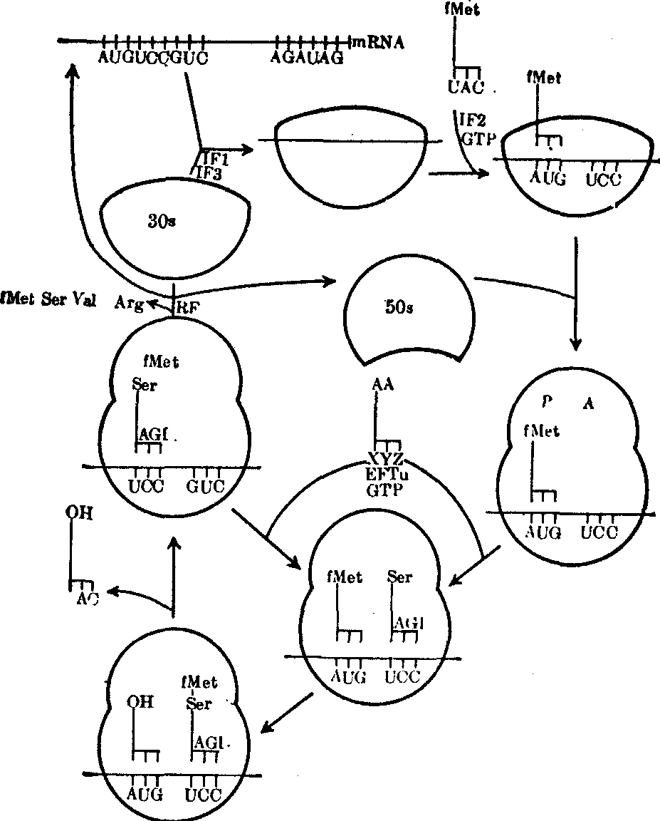 蛋白质生物合成简称“蛋白质合成”。与核酸密切相关。脱氧核糖核酸(DNA)具有蛋白质合成的遗传信息,在合成过程中,以DNA为模板转录合成的多种RNA,其中mRNA是合成蛋白质的直接模板,通过它使DNA上储存的遗传信息传递给蛋白质,还需来自三磷酸腺苷及三磷酸鸟苷的高能磷酸键中的能量为能源,以及细胞代谢中形成的氨基酸为原料,通过氨基酸激活,肽链合成起始,肽链的延伸和它的合成终止与释放,肽链合成后的加工处理等一系列过程,形成蛋白质。 蛋白质生物合成 蛋白质生物合成蛋白质生物合成是机体根据存在于DNA上的遗传信息,将氨基酸聚合成具有相应结构的蛋白质的整个过程。遗传信息的传递先从DNA转到RNA,再从RNA转到蛋白质,前者称转录,后者称翻译,蛋白质合成包含这两大阶段的一系列反应; 不过蛋白质合成也常狭义地仅指按mRNA的信息聚合氨基酸这段反应。所以常视翻译为蛋白质合成的同义词。唯翻译偏于从信息流动上考虑,而蛋白质合成除信息传递之外尚有其他很多生物化学反应。本卷另有“核糖核酸的合成”条,本条着重介绍从RNA到蛋白质的翻译这一阶段。 蛋白质的功能决定于其结构,而空间结构决定于一级结构,因此使蛋白质的一级结构亦即氨基酸残基排列顺序忠实表达出mRNA上的信息是蛋白质合成上的关键,否则合成的蛋白质就会失去其本应具备的功能。保证翻译无误的机理,必定十分精巧复杂,所以对蛋白质合成直到近20年来才有较深的认识。合成过程大致可分为氨基酸的活化作用、多肽链合成启动、肽链的延长、肽链合成的终止等主要步骤,参加到这些步骤的大小分子有一二百种之多。 氨基酸活化 一个氨基酸的羧基和另一个氨基酸的氨基反应生成肽链,在热力学上是困难的,只有羧基经活化后才可进行,所以蛋白质生物合成的第一步是: 作为蛋白质原料的20种氨基酸均得转成为活化的氨基酰tRNA形式。该反应由氨基酰tRNA合成酶(又称氨基酸活化酶)所催化。 现已分离出高度特异、能分别催化20种氨基酸的高度纯化的酶蛋白,它们的分子量在100 000~240 000之间,有些是单条肽链如亮氨酰tRNA合成酶,有些含两个或四个相同亚基如色氨酰tRNA合成酶,还有含两种不同亚基的如甘氨酰tRNA合成酶,它含分子量为33 000的α亚基和8000的β亚基各两个。这一反应需要Mg2+。 在活化反应中,ATP分解为AMP和焦磷酸,而氨基酸转移到tRNA的过程又分两步。第一步是氨基酸与ATP反应,置换焦磷酸而形成结合在酶分子上的中间产物: 氨基酰腺苷酸。氨基酸的羧基借酸酐键与AMP的5′-磷酸相连,这高能的酸酐键活化了氨基酸的羧基。第二步则是氨基酰基团从AMP转移到tRNA的3′端,产物氨基酰tRNA和AMP都从酶分子上脱落下来。上述两步反应为。 氨基酸借其活化了的羧基与tRNA3′端CCA中AMP的自由2′羟基或3′羟基酯化则视不同的合成酶而异。 活化反应的标准自由能减少很小,以一个ATP高能键为代价而形成的氨基酸与tRNA之间的酶键仍是高能键。由于活化反应中产生的焦磷酸随即被焦磷酸酶水解,每一氨基酸分子的活化要耗两个高能磷酸键,因此,在细胞里氨基酸的活化实际上并不可逆。 氨基酰tRNA合成酶对氨基酸及其对应tRNA都具有高度特异性,这甚为关键,因为在蛋白质合成中对氨基酸的识别只靠tRNA分子上的三联体反暗码子和mRNA上的暗码子配对。因此氨基酰tRNA合成酶必需分别具有和氨基酸及tRNA结合的非常特异的部位。在细胞内的条件下,合成酶对天然氨基酸的识别可说是万无一失的,因为其特异识别确是10 000次也不出现一次差错。此等精确的机理可从异亮酰tRNA合成酶得到说明: 该酶要区分只差一个亚甲基的异亮氨酸和缬氨酸。该酶对这两种氨基酸的结合相差是很大的,Km异=5μmol和Km缬=400μmol,况且酶异亮氨酰腺苷酸复合体遇到相应的tRNA异就形成异亮酰tRNA异,但是酶缬氨酰腺苷酸复合体遇到对异亮氨酸特异的tRNA异则迅速水解为自由的缬氨酸和AMP。 多肽合成链启动 蛋白质合成在核蛋白体上进行,核蛋白体是随蛋白质合成的开始而由核蛋白体小亚单位(真核细胞的40s,原核细胞的30s)和大亚单位(真核细胞的60s,原核细胞的50s) 缔合而成 (真核细胞的核蛋白体80s,原核细胞的70s),也随蛋白质合成的结束而解缔。实际上,解缔是合成的先决条件,因为蛋白质合成从小亚单位开始。合成的起始很复杂,参加这过程的除了大小亚单位外,尚有起始氨基酰tRNA、GTP、mRNA以及叫做起始因子的特殊蛋白质。原核细胞含起始因子1、2和3 (IF1、IF2、IF3),分子量分别为9000、6500和21 000,它们都不是核蛋白体上的固有成分。真核细胞起始因子已发现有eIF1、eIF2、eIF3、eIF4A、eIF4B、eIF4C及1IF5等。起始氨基酰tRNA在原细胞是N甲酰蛋氨酰tRNA (fMet-tRNAf蛋)。细菌里有两种携带蛋氨酸的tRNA,一种在带上蛋氨酸后可借特殊甲酰转移酶催化,从甲酰四氢叶酸接受甲酰基而生成N甲酰蛋氨酰tRNA。 N10甲酰四氢叶酸+Met—tRNAf蛋—→四氢叶酸+fMet—tRNAf蛋,该酶不催化自由蛋氨酸甲酰化,也不催化接连在另一tRNA蛋上的蛋氨酸。fMet—tRNAf蛋不仅起始原核细胞肽链的合成,而且起始真核细胞里线粒体的蛋白质合成。真核细胞脑浆核蛋白体所进行的蛋白质合成是由未甲酰化的蛋氨酰tRNAf蛋起始的。这种蛋氨酰tRNAf蛋在体外可被细菌甲酰转移酶催化而甲酰化,而不作为起始的另一种蛋氨酰tRNA蛋则不被甲酰化,显然在真核细胞里也有不同