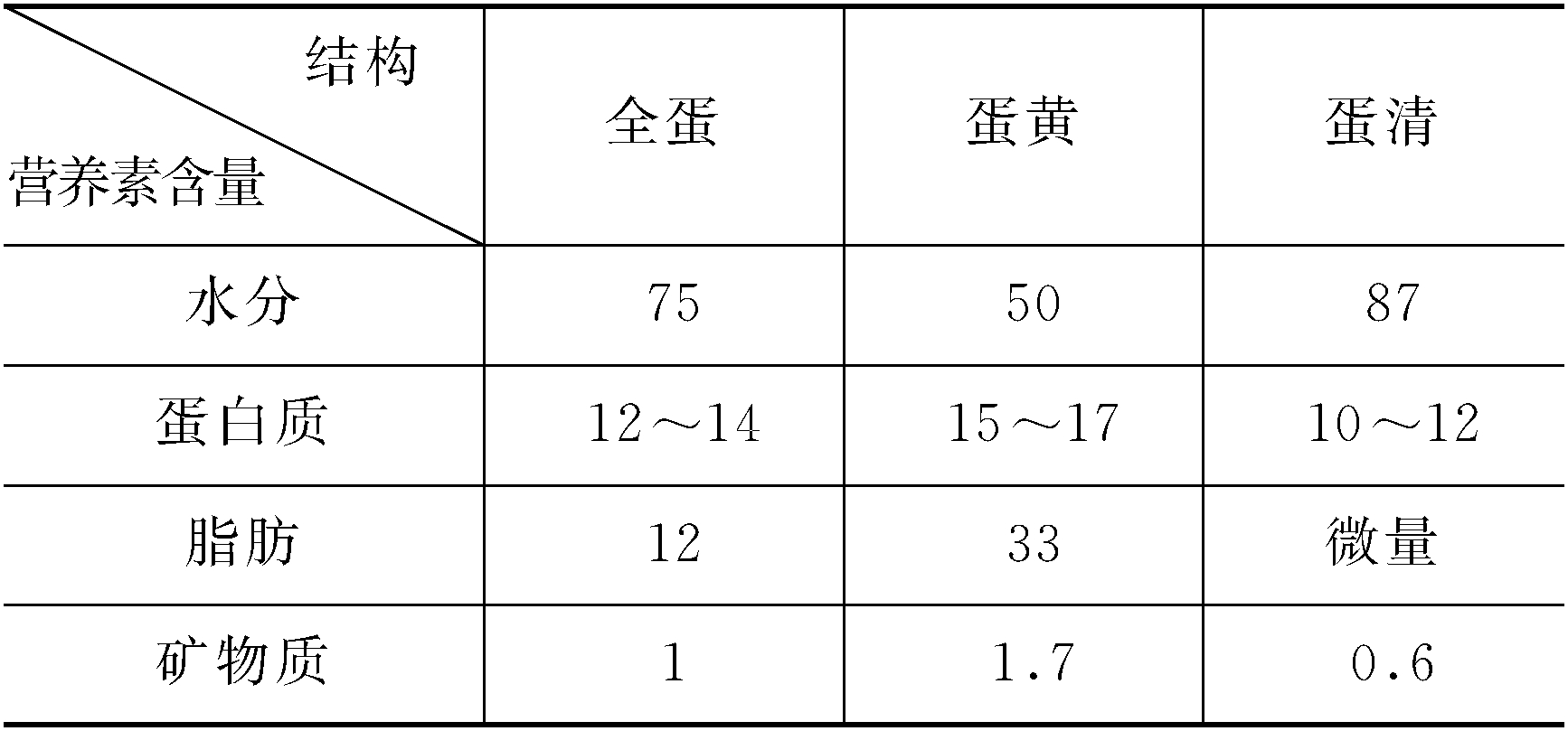 释义 | 蛋的营养价值每只鸡蛋平均重50 g左右,表面积65 cm2。蛋壳约占全蛋质量的11%(其中96%为碳酸钙,2%为碳酸镁,2%为蛋白质)。蛋黄和蛋清分别占总可食部分的1/3和2/3。每100 g鸡蛋中含胆固醇585 mg,每100 g蛋黄中含胆固醇1510 mg,但是蛋黄中又含一定量卵磷脂,因此鸡蛋不可多食又不可禁食,每天食用1~2个为宜。蛋类含矿物质和维生素丰富。每100 g鸡蛋含钙44 mg,铁2.3 m,磷182 mg,维生素含量为194 μg,硫胺素为0.13 mg,核黄素为0.32 mg,尼克酸为0.2 mg。鸡蛋各部分的主要营养组成见下表(单位:质量分数%): |