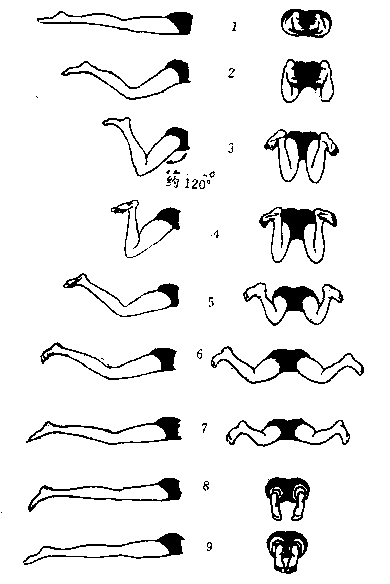 ❸蹬夹水:翻脚后由大腿发力,通过展髋、伸膝,以脚、小腿内侧、大腿后侧做快速而有力的蹬夹水动作。蹬夹水的路线:开始时脚略向外,蹬至近一半时转向里蹬夹水,两腿伸直并拢时结束。