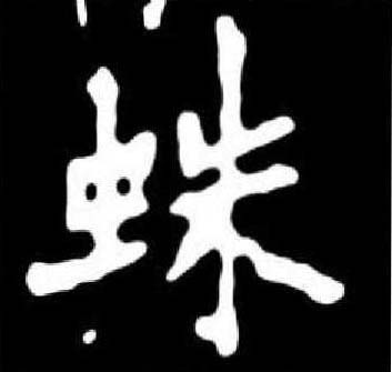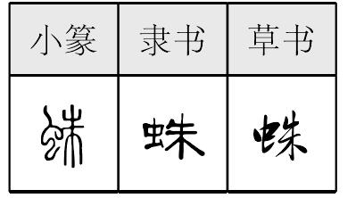 【提示】朱,中间是竖,不是竖钩。 *蛛zhū12画 虫部 见“蜘”(518页)。 蛛 ☚ 蠅 鼂 ☛ 蛛zhū春秋金文至小篆从黾(měng,一种蛙,古代也算虫),朱声。小篆蜘字本也从黾,或从虫,知声,知字右旁都从于,从甲骨金文继承而来。蛛虽用于蜘蛛,但从来单用。先秦无蜘字。春秋金文假借为国名。或作邾,从右耳刀(邑),朱声。小篆隶楷继承。《春秋公羊传》作邾娄,可能古音双音节,或复辅音。战国后又称邹(zōu),在今山东邹县。蜘蛛是节肢动物,有足4对,腹部下方有丝腺开口,能分泌黏液,织网粘捕昆虫作食料。种类很多。古汉语单用。如:蛛网|蛛丝马迹。现俗称蛛蛛。 蛛★常◎常