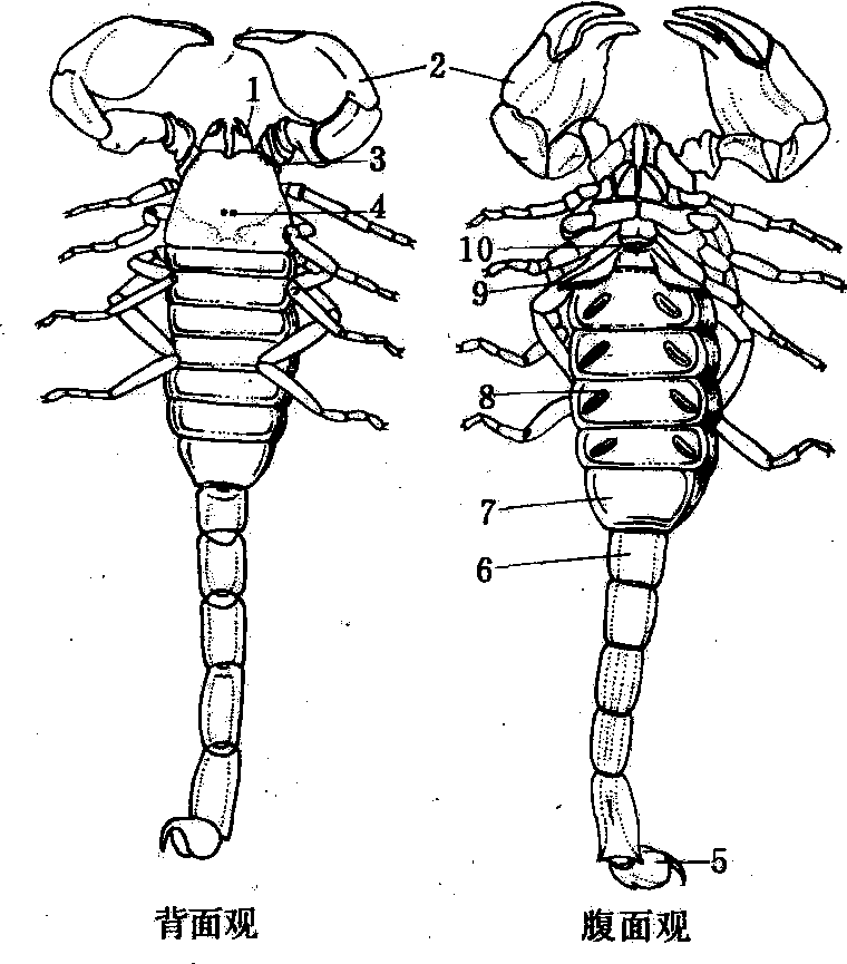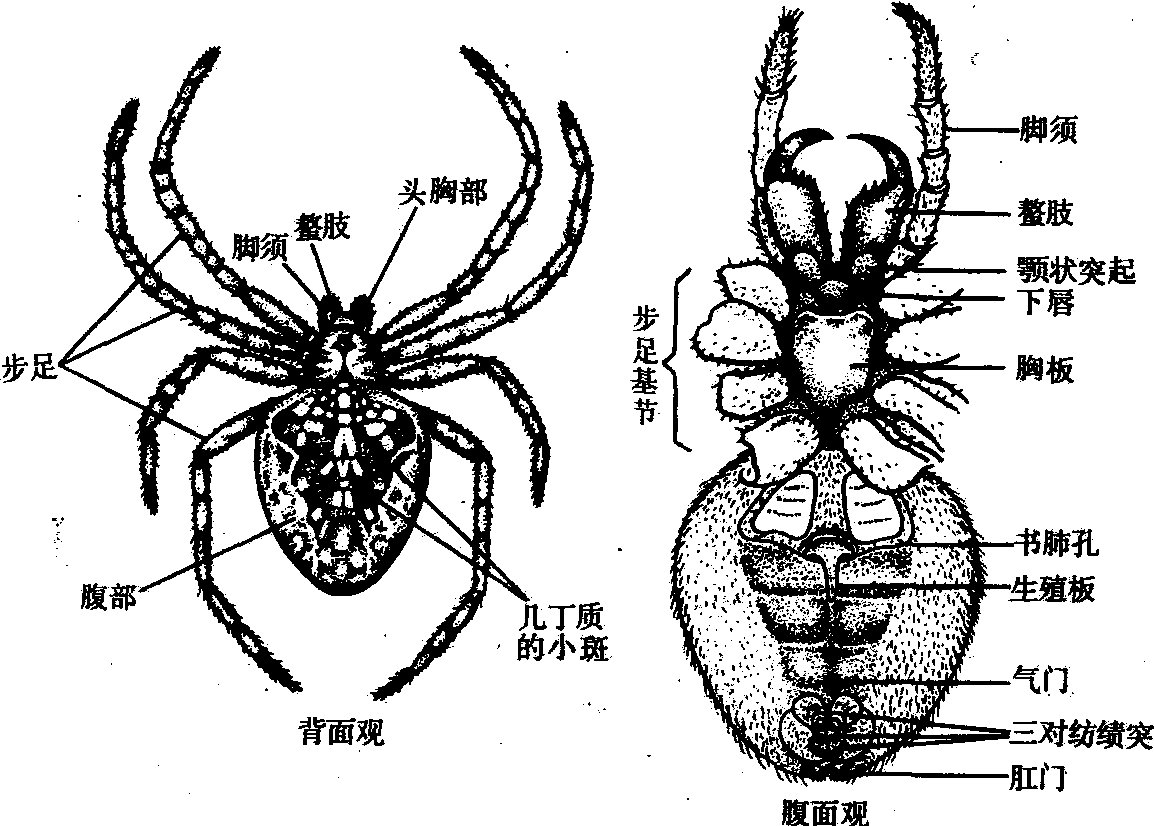 释义 | 蛛形纲Arachnoidea有螯肢和脚须,无触角,以书肺或气管呼吸的节肢动物。常见的种类如蜘蛛、蝎、蜱、螨等。 图 1 钳 蝎 1. 螯; 2. 脚须; 3. 侧眼; 4. 中眼; 5. 尾节;6. 后腹;7. 前腹; 8. 气孔; 9. 栉状器; 10. 生殖厣 蛛形目(Aranelida) 头胸部和腹部均不分节,两部之间有明显的横缢,头前方通常有单眼8个,螯肢呈钳状,脚须与步足相似,雄性的末节膨大成交接器,步足4对,适于步行或跳跃。每步足末端有2钩爪。腹部腹面后端肛门之前有纺绩突起(图2)。种类较多如圆蛛、球腹蛛、蝇虎、壁钱等。大腹圆蛛(Aranea ventricosa)是蛛形目最常见的种类。体分头胸部和腹部。头胸部有4对单眼、6对附肢。第1对为螯肢,第2对为脚须,4对步足。腹部无附肢。有生殖板盖住生殖孔。两边有气孔1对; 后有纺绩突3对: 纺绩突前有筛器使分泌物成丝状,后有肛门。栖息屋檐下、农田中捕食昆虫。分布中国南北各地(图2)。