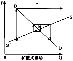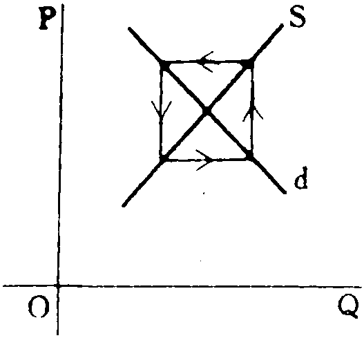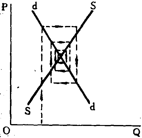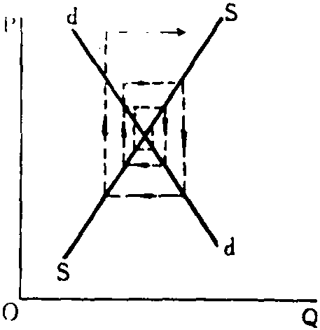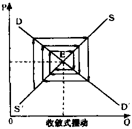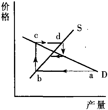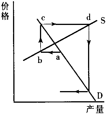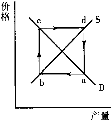 (3) 根据上述假定,当市场上商品价格与产量偏离均衡状态时,价格与产量将表现出周期性的循环变动。具体地,随供给函数和需求函数形式的不同,波动表现为三种不同的情形,最终的均衡状态也有三种不同结果,参见下图。 在下图中,假设初始状态均在a点,那么在方程(1)—(3)所决定的供求关系作用下,价格-产量波动的路径将为abcd……。在第一种情形下,波动过程将无限循环下去,既不会达到均衡状态,也不会偏离均衡点更远,这是封闭型蛛网。在第二种情形,波动过程将越来越偏离均衡状态,这是“发散型蛛网”。在第三种情形,波动过程将无限逼近均衡状态,这是“收敛型蛛网”。 之所以出现三种不同情形,是因为生产者对价格变化作出反应的程度不同。在供给与需求均为价格的线性函数时,波动的类型完全取决于供给线与需求线斜率的相对大小。在供给与需求为价格的非线性函数时,波动的类型仍可通过求解上述(1)、(2)、(3)三个方程来确定。 蛛网定理一般用来解释生产周期较长的商品如牲畜、玉米、葡萄酒等的价格与产量波动情况。它是本世纪30年代由美国的H·舒尔茨、荷兰的J·丁伯根等各自独立提出的,并由英国的N·卡尔多建议命名。