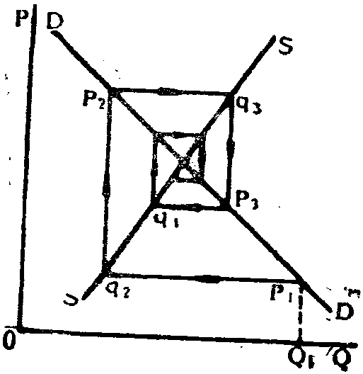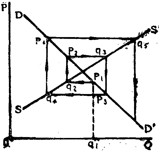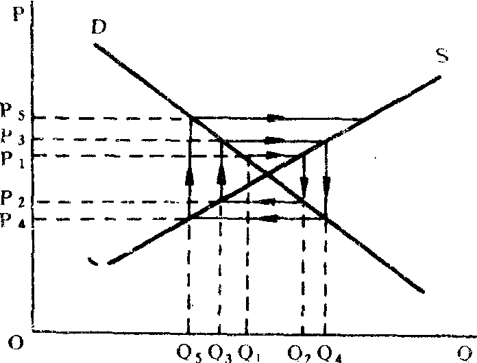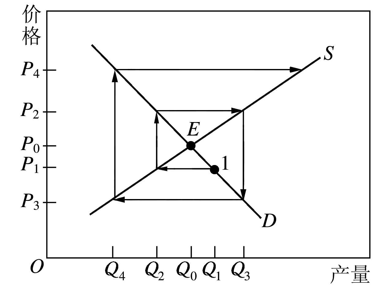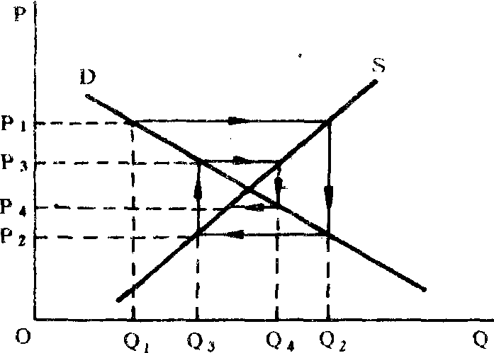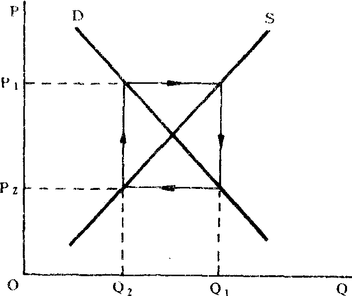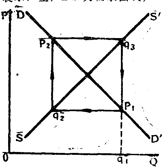 释义 | 蛛网理论cobweb theorem现代资产阶级经济学用来解释某些商品,特别是农产品的产量和价格失去均衡时发生不同波动情况的理论。它把不同波动情况归纳为3种类型,用图形表示其波动的轨迹,状如蛛网,称为蛛网模型。它以下列假定为前提:每一生产者认为现行市价不会改变;一定时期内生产计划和规模不发生变化;所提供的产品必须是非耐久性的,所能存储的数量较少。由于商品的供给弹性和需求弹性的不同,价格和产量的波动出现3种情况:当供给弹性小于需求弹性,市价变动对供给量的影响小于对需求量的影响时,波动将逐渐减弱,最后恢复均衡,称为收敛蛛网;当供给弹性大于需求弹性,波动逐渐加剧,不能恢复均衡,称为扩散蛛网;当供给弹性和需求弹性相等时,波动轨迹沿着一条封闭线循环下去,称为稳定蛛网。1934年英国卡尔多(N. Kaldor)定名为蛛网理论。 蛛网理论Cobweb Theorem运用弹性理论研究某些具有周期性特征商品的价格和产量,在供求失衡时所发生的动态调整过程的理论。该理论所研究的商品具有如下特征:(1) 生产周期较长,且生产计划确定后期中不能变更; (2) 供给量的变动存在时滞,商品从开始生产到投放市场需要一定的时间间隔; (3)供给量取决于前期的价格,当前的价格仅影响当前的需求量和下一期的供给量。一般说来,农产品具有上述特征。用公式表示为: Qdt=f (Pt) ❶需求弹性大于供给弹性,即价格变动对需求量的影响大于对供给量的影响。在这种情况下,价格和产量在各期的波动将不断缩小而趋向于均衡点,此类蛛网通常称为“收敛型蛛网” (见图1)。 ❷需求弹性小于供给弹性,即价格变动对需求量的影响小于对供给量的影响。在这种情况下,价格和产量在各期的波动将不断加大并离供求均衡点越来越远,此类蛛网通常称为 “发散型蛛网” (见图2)。 ❸需求弹性等于供给弹性,即价格的变动对需求量和供给量有同样的。在这种情况下,价格和产量在各期的波动将维持不变并一直持续下去,此类蛛网通常称为“封闭型蛛网” (见图3)。蛛网理论是一种动态均衡分析方法,在20世纪30年代分别由美国经济学家舒尔茨、意大利经济学家里奇和荷兰的经济学家丁伯根在不同的论文中各自独立提出其基本思想,后由英国经济学家卡尔多(1934)第一次正式提出 “蛛网理论”这一名称。 图1 图2 图3 蛛网理论又称“蛛网模型”。研究人们的价格预期对产品产量的波动所造成的影响的理论。1934年,英国经济学家卡尔多(Kaldor,Nicholas,1908—1986)研究发现,价格和产量的连续变动过程在图形上类似于蛛网,故命名为“蛛网模型”。它分为三种情况: 图1 2. 发散型蛛网。当需求价格弹性小于供给价格弹性,即价格变动对需求量的影响小于价格变动对供给量的影响时,价格和产量在各期的波动将不断扩大,离均衡点越来越远。在图2中,需求曲线D比供给曲线S陡峭,表明该种产品的需求价格弹性小于供给价格弹性。在第一期,产量为Q1,大于均衡产量Q0,引起价格从均衡价格P0降至P1。价格下降,引起第二期生产下降,降至Q2。产量下降,引起价格上升,升至P2。价格上升,引起第三期生产增加,增至Q3。产量增加,又引起价格下降,降至P3。价格下降,又引起第四期生产下降,降至Q4。产量下降,又引起价格上升,升至P4。这就形成了价格与产量之间的一种发散型的周期性波动。需求价格弹性小于供给价格弹性是蛛网趋向发散的条件。许多农产品的供给对价格变动的反应较大,而农产品的需求相对较为稳定,对价格变动的反应较小,所以农产品往往呈现出发散型蛛网。 图2 3. 封闭型蛛网。当需求价格弹性等于供给价格弹性,即价格变动对需求量的影响等于价格变动对供给量的影响时,价格和产量在各期的波动将维持不变,并一直持续下去。图3给出了这种情况。这种情况形成了价格与产量之间的一种封闭型的周期性波动。需求价格弹性等于 图3 蛛网理论 蛛网理论Cobweb Theorem亦称“蛛网定理”。是关于某些商品,特别是农产品的价格和产量失去均衡时,受供给弹性和需求弹性影响而发生各种波动的理论。因在供求曲线图上价格和产量波动的轨迹形如蛛网而得名。蛛网理论持如下一些假定,在完全竞争条件下,个别生产者改变产量不会影响市场价格,因而每个生产者都预期价格会保持不变;商品生产存在着一定的生产周期,在同一个周期内,产量不发生变化; 价格的变动只会影响下一个周期的产量,而本期的价格由本期的产量决定; 没有或很少有储备。由于各种商品的供给弹性和需求弹性不同,使得价格和产量处于不均衡状态时发生不同形式的波动,可以把这些波动归纳为三种情况: (1)供给弹性小于需求弹性时,波动逐渐减弱,最后恢复均衡,表现为收敛型蛛网 (见图1) ; (2)供给弹性大于需求弹性时,波动愈益加剧,无法恢复均衡,表现为扩散型蛛网(见图2);(3)供给弹性同需求弹性相等时,波动一直循环下去,表现为稳定型蛛网 (见图3) 。在供求曲线图上,可以找出每一种情况下价格和产量的波动轨迹,现以第一种情况为例:图上的纵轴P表示价格,横轴Q表示产量,DD′为需求曲线,SS′为供给曲线,DD′与SS′两条曲线的交点代表商品的均衡价格,假定在第一个周期,商品产量由于某种原因达到q1,供过于求,价格为p1,小于均衡价格,使得生产者在第二个周期将产量减少为q2; 价格在第二个周期上升为p2,大于均衡价格,使得生产