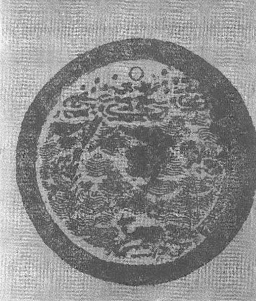 宋。直径15.58厘米,边厚1.4厘米。重775克。1984年河南省宝丰县出土。河南省宝丰县文化馆藏。铜镜圆形,背面正中有圆形素钮,钮外饰蛟龙闹海图:钮上方浮云飘动,明月当空,星斗闪耀。钮左右惊涛骇浪中一水柱直冲云端,有一蛟龙正喷水嬉戏。钮下海浪拍岸,一海兽惊恐奔逃于怪石之间,并回首窥视。钮右也有狂浪中挣扎的同类。右边沿阴刻有铭文“承直郎河北西运户判监铸梁作”共计13字。“梁作”表明由梁氏官工监作,是官铸铜镜。
